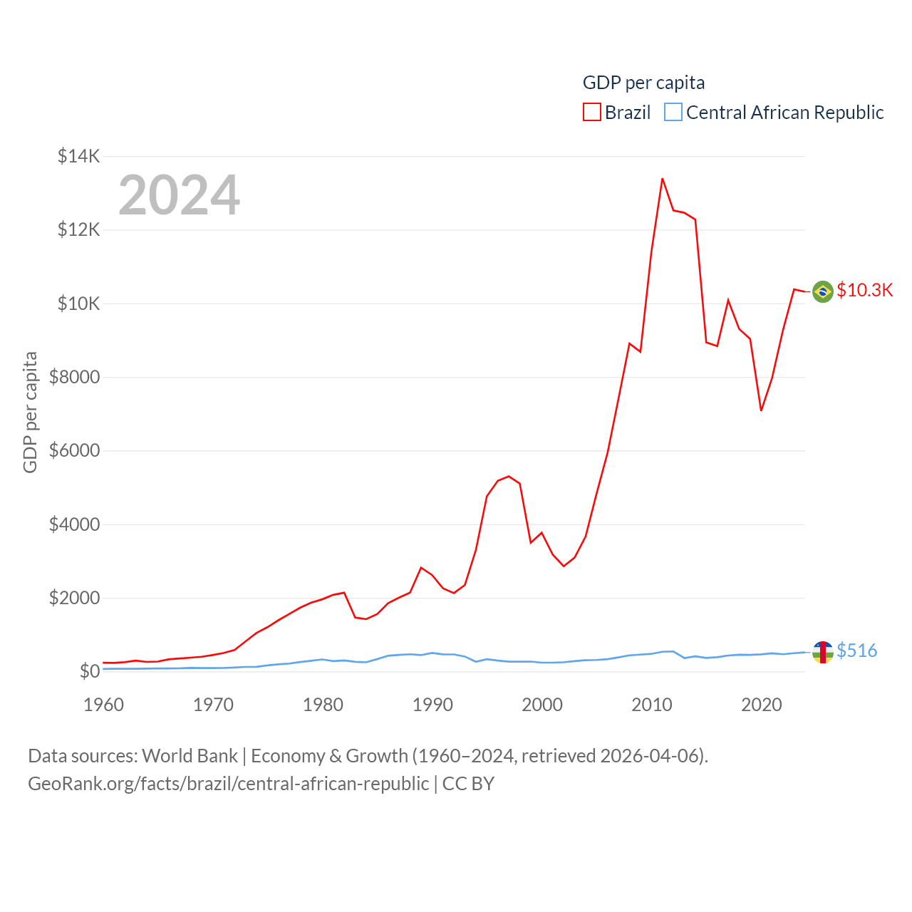 By GDP, Brazil ranks 10/197 ($2.19T) and The Central African Republic ranks 171/197 ($2.75B). By GDP per capita, Brazil ranks 85/197 ($10,311), while The Central African Republic ranks 195/197 ($516).