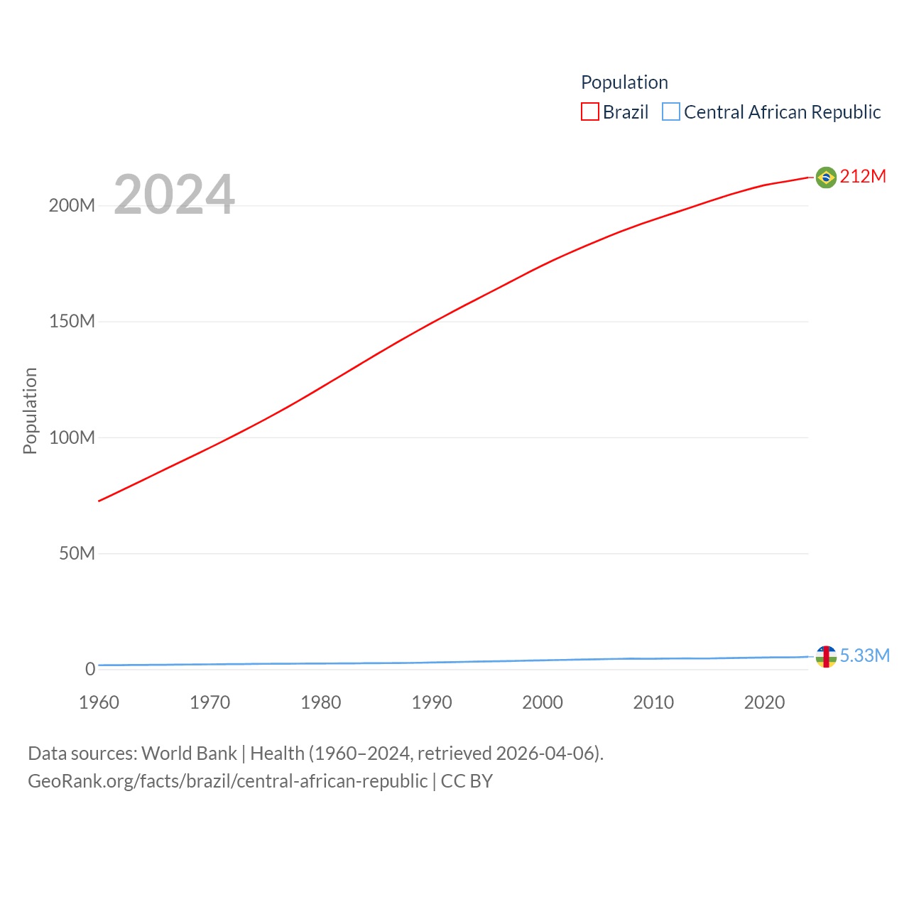 Brazil has a population of 212M (ranked 7/197), compared with 5.33M in The Central African Republic (ranked 121/197). Brazil's land area is 3,227,096 sq mi versus 240,534 sq mi for The Central African Republic (ranked 5th vs. 43rd).