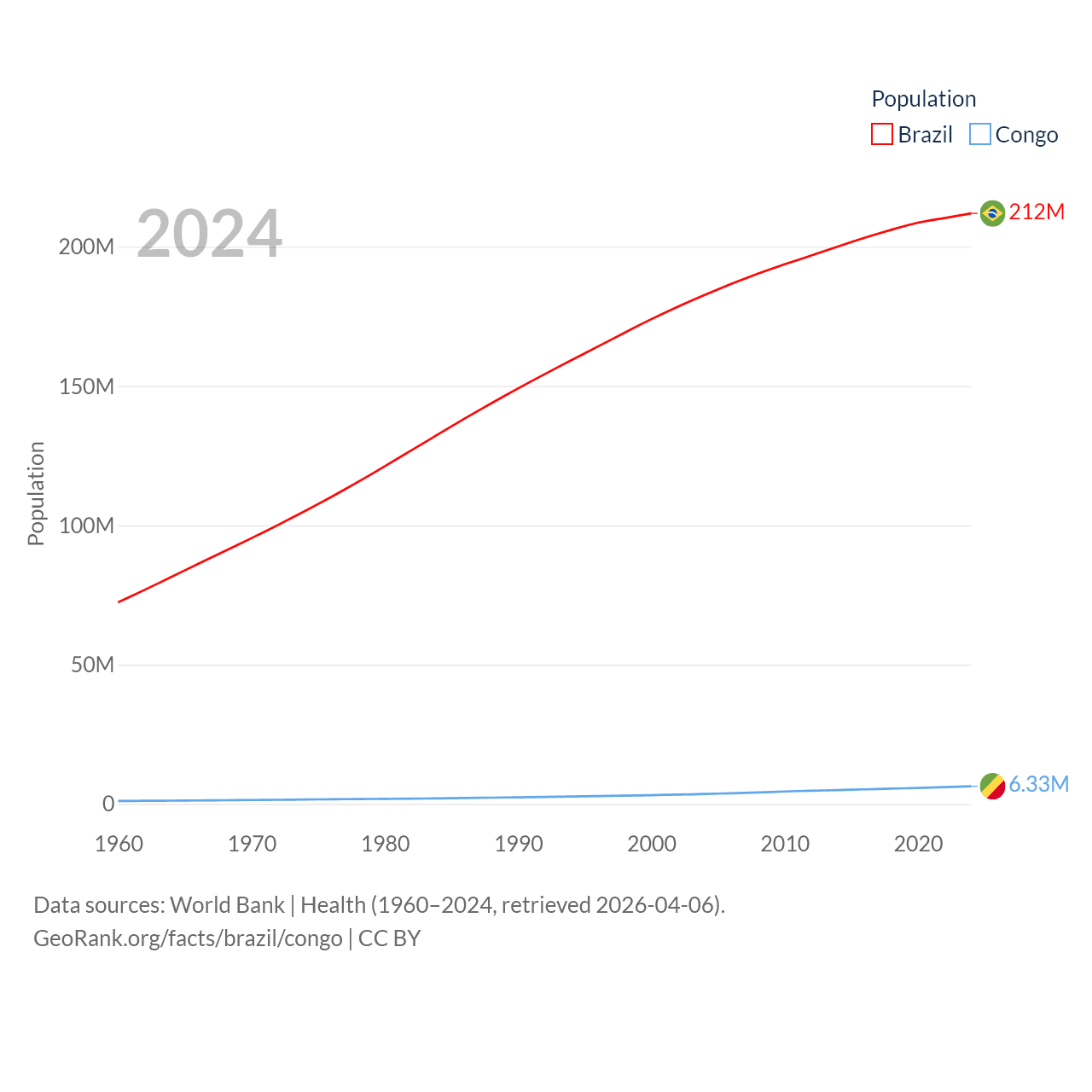 Brazil has a population of 212M (ranked 7/197), compared with 6.33M in The Congo (ranked 112/197). Brazil's land area is 3,227,096 sq mi versus 131,854 sq mi for The Congo (ranked 5th vs. 64th).