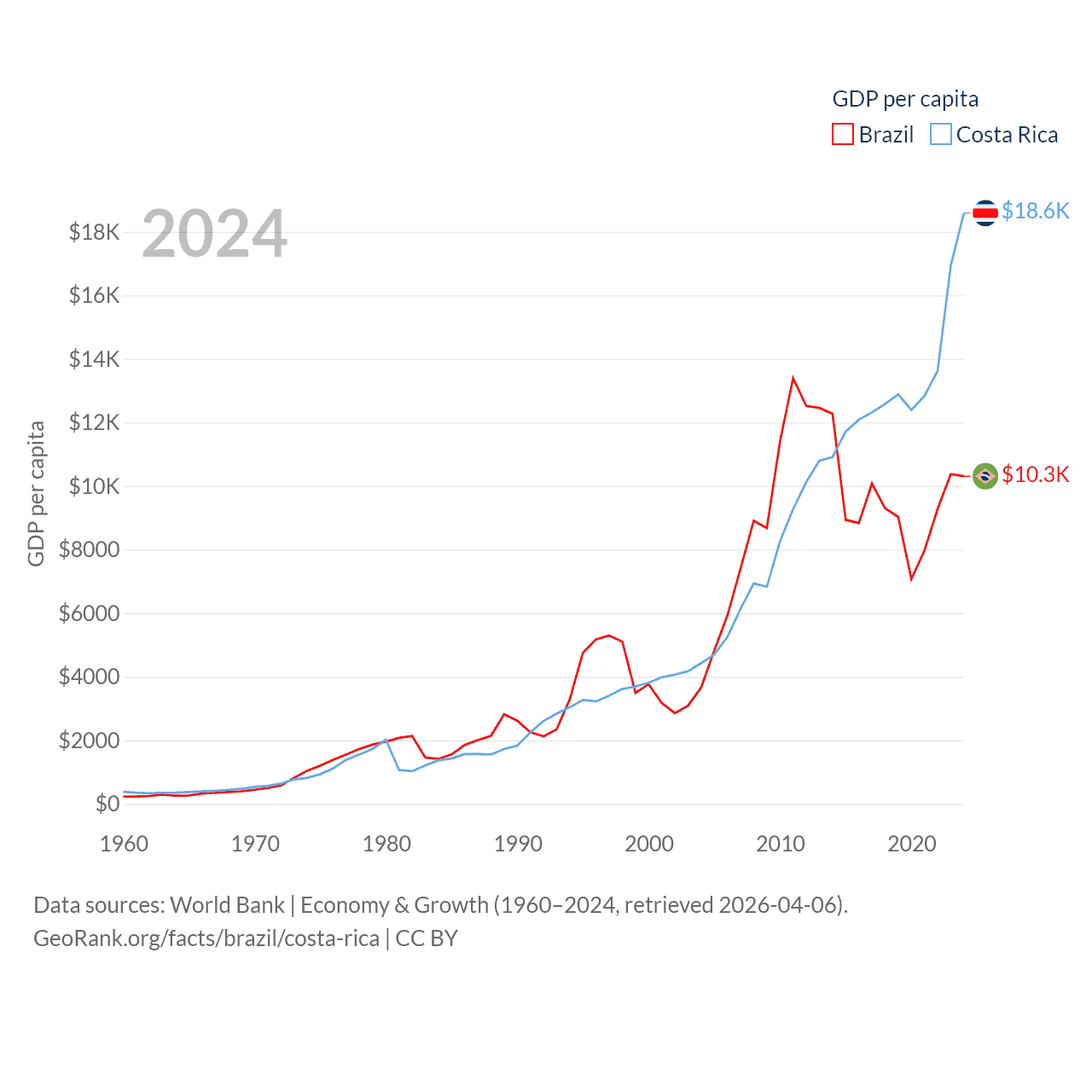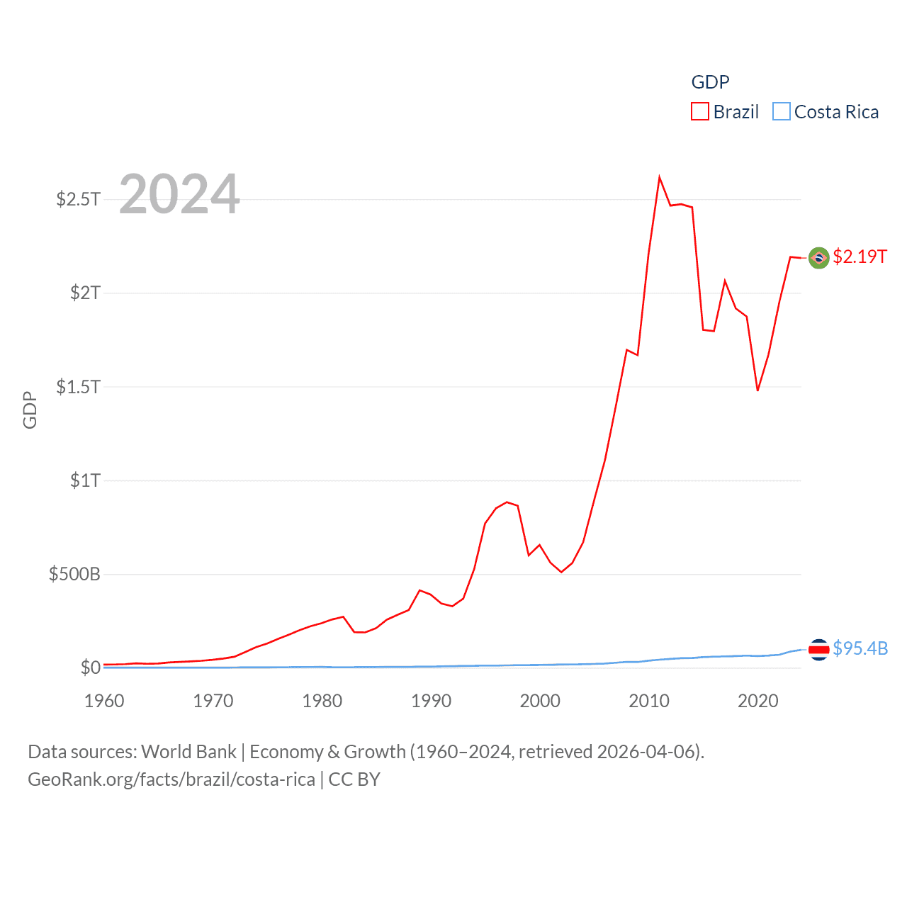 By GDP, Brazil ranks 10/197 ($2.19T) and Costa Rica ranks 73/197 ($95.4B). By GDP per capita, Brazil ranks 85/197 ($10,311), while Costa Rica ranks 62/197 ($18,587).