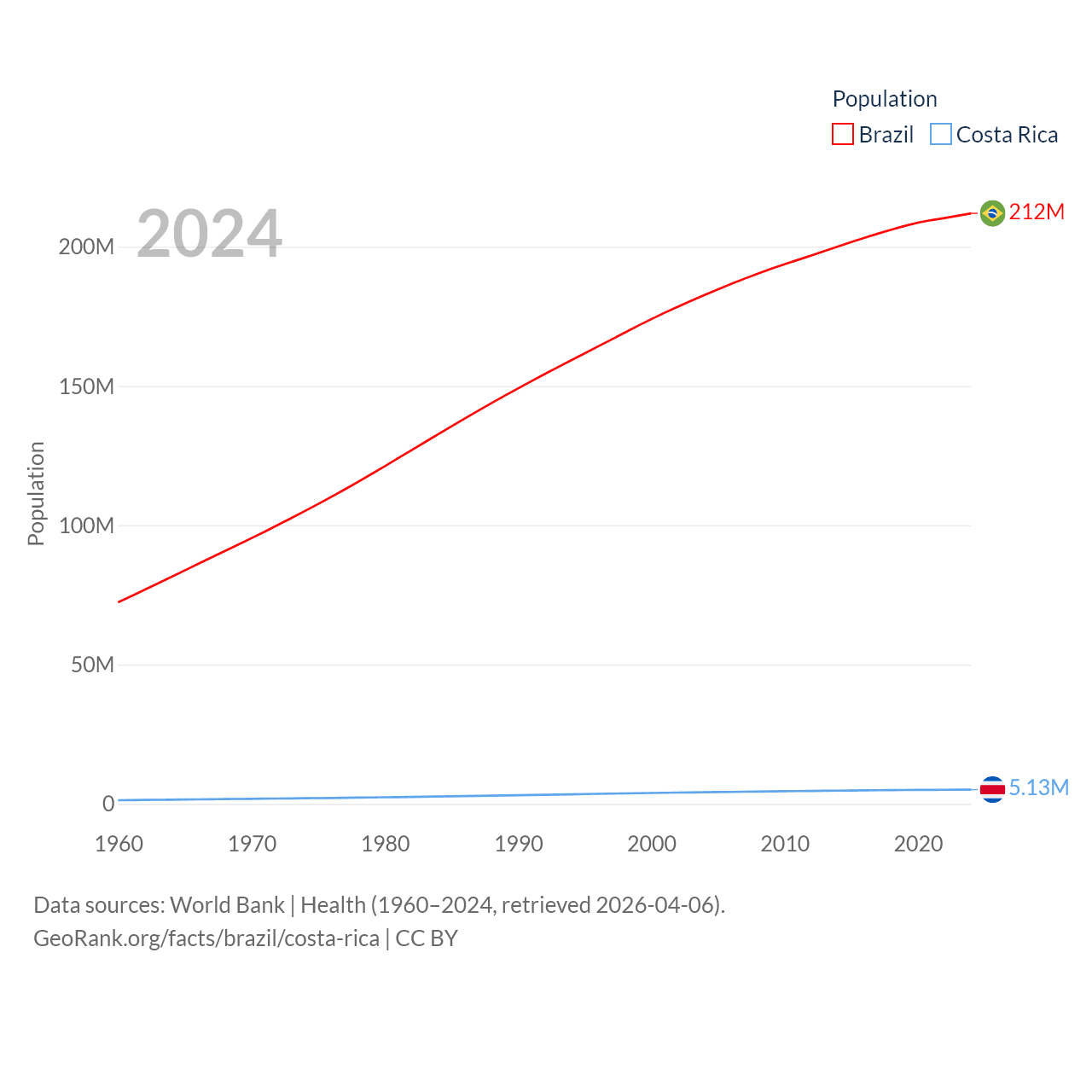 Brazil has a population of 212M (ranked 7/197), compared with 5.13M in Costa Rica (ranked 126/197). Brazil's land area is 3,227,096 sq mi versus 19,714 sq mi for Costa Rica (ranked 5th vs. 126th).