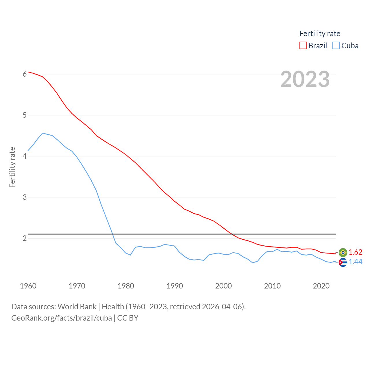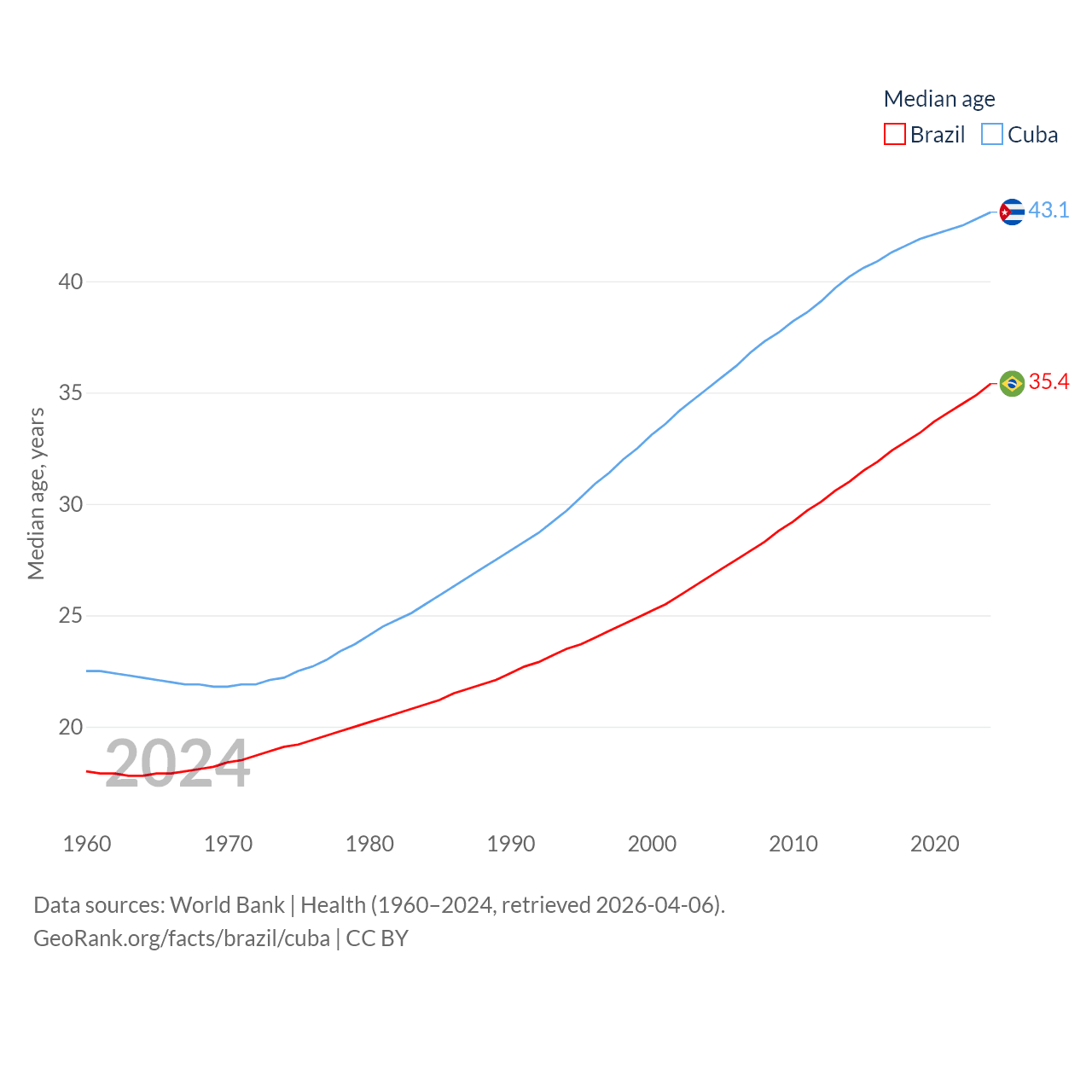 Brazil has a population of 212M (ranked 7/197), compared with 11M in Cuba (ranked 87/197). Brazil's land area is 3,227,096 sq mi versus 40,077 sq mi for Cuba (ranked 5th vs. 103rd).