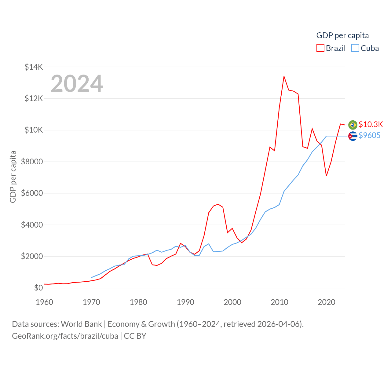 By GDP, Brazil ranks 10/197 ($2.19T) and Cuba ranks 69/197 ($107B). By GDP per capita, Brazil ranks 85/197 ($10,311), while Cuba ranks 86/197 ($9,605).