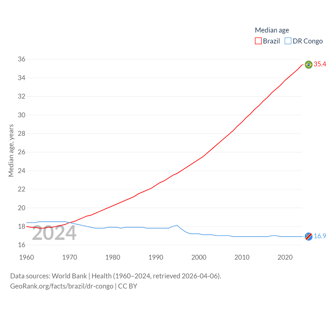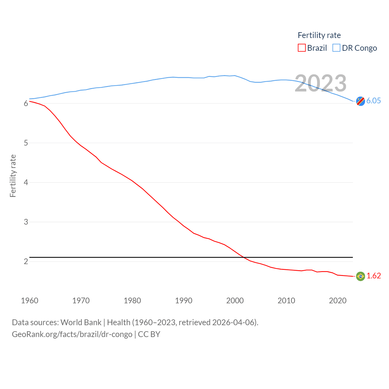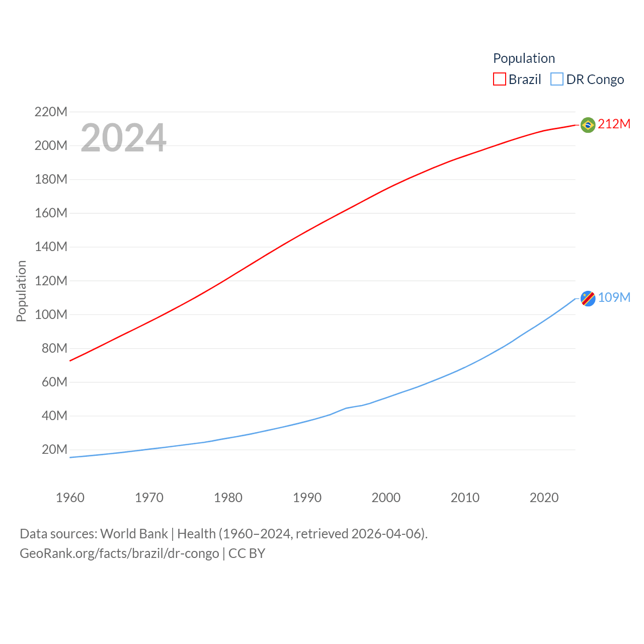 Brazil has a population of 212M (ranked 7/197), compared with 109M in The DR Congo (ranked 15/197). Brazil's land area is 3,227,096 sq mi versus 875,313 sq mi for The DR Congo (ranked 5th vs. 11th).