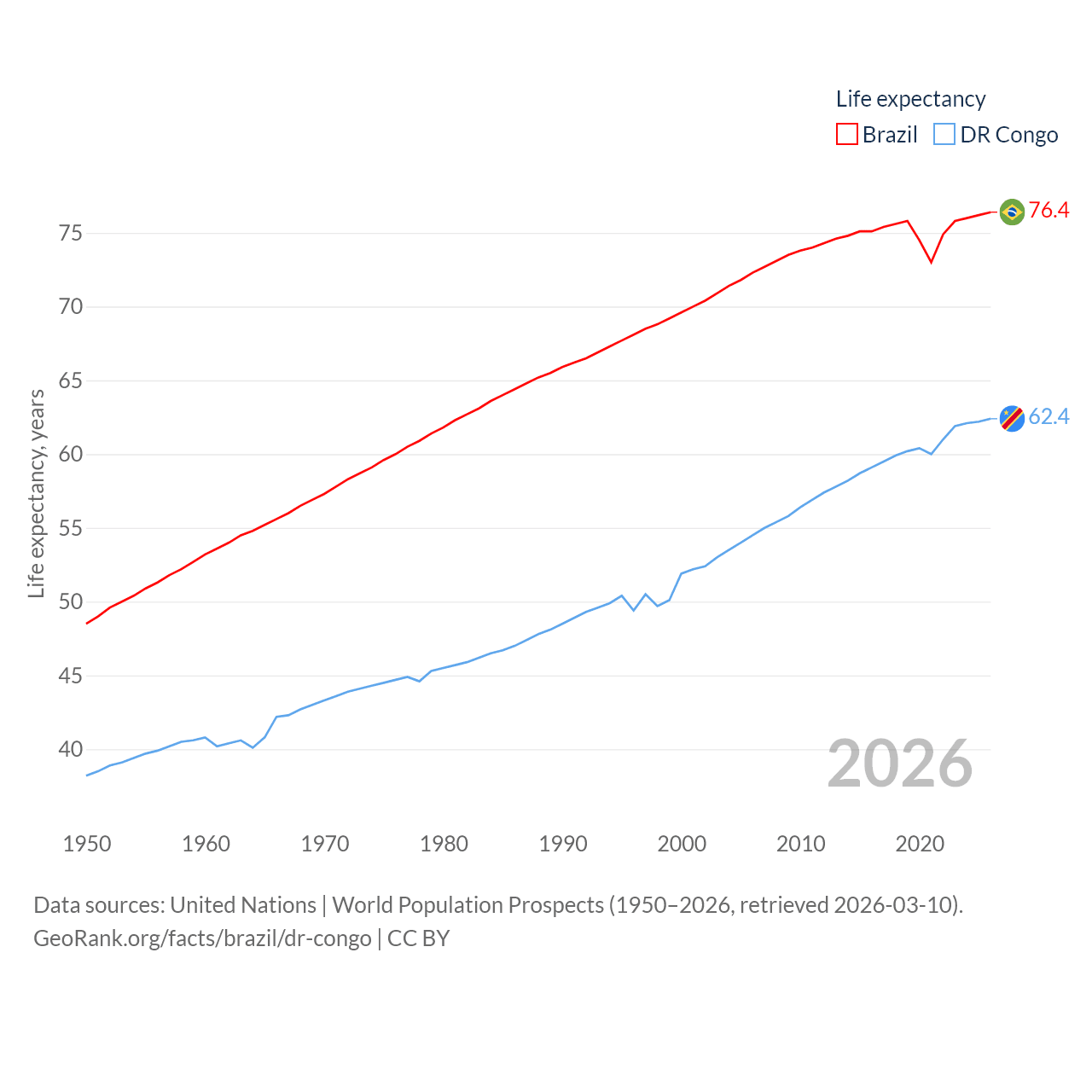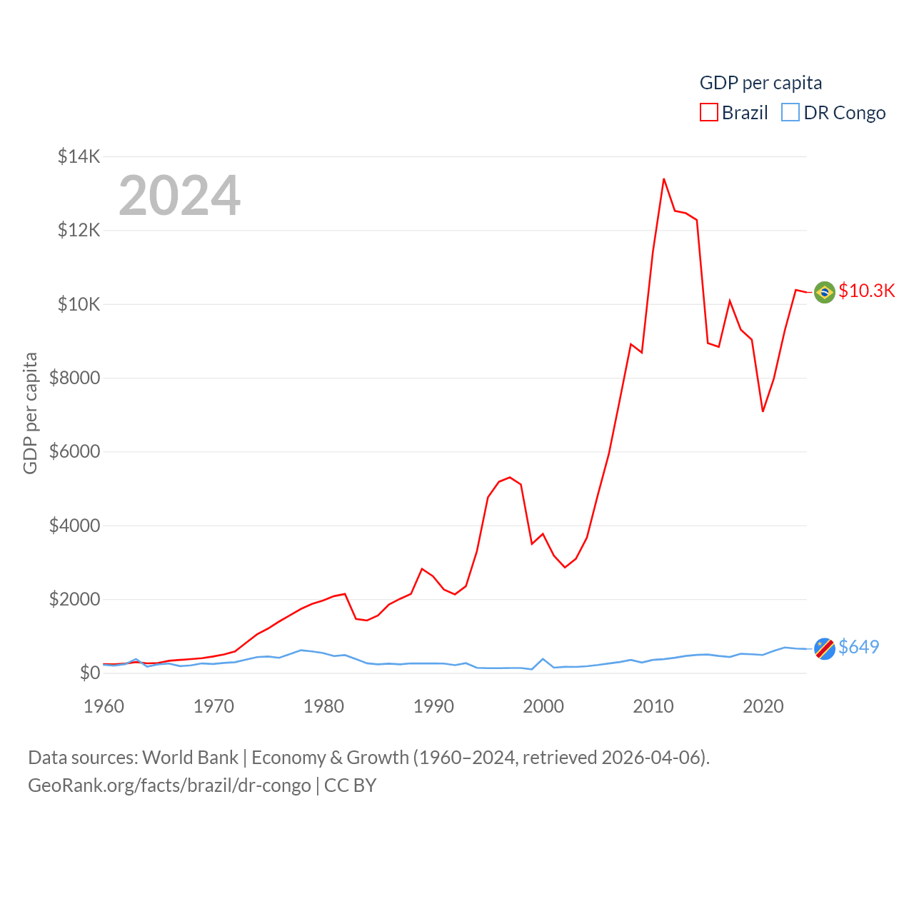 By GDP, Brazil ranks 10/197 ($2.19T) and The DR Congo ranks 87/197 ($71B). By GDP per capita, Brazil ranks 85/197 ($10,311), while The DR Congo ranks 190/197 ($649).