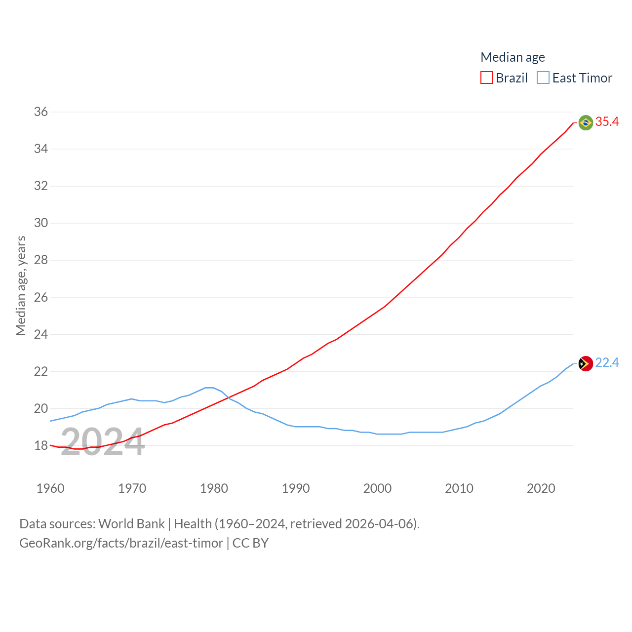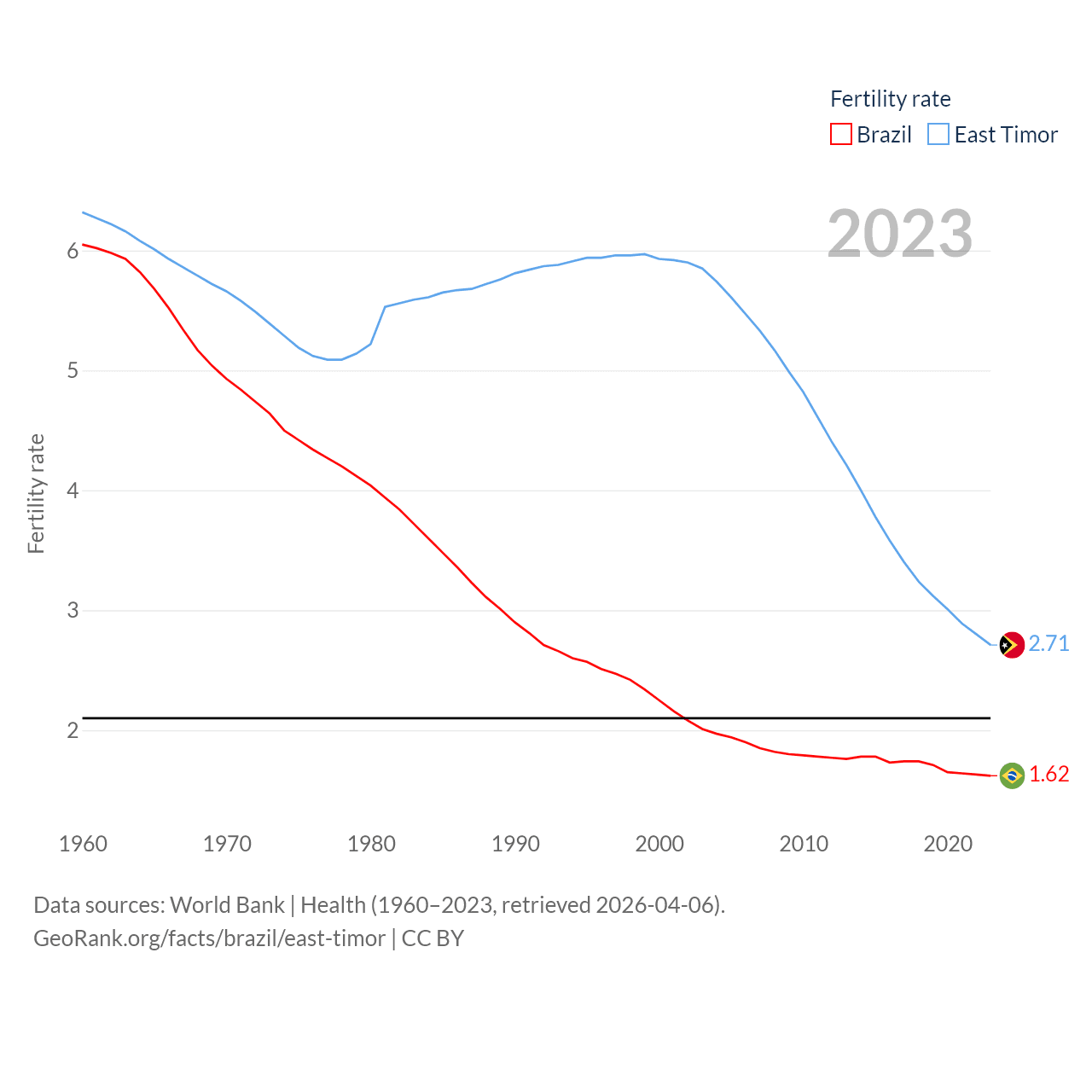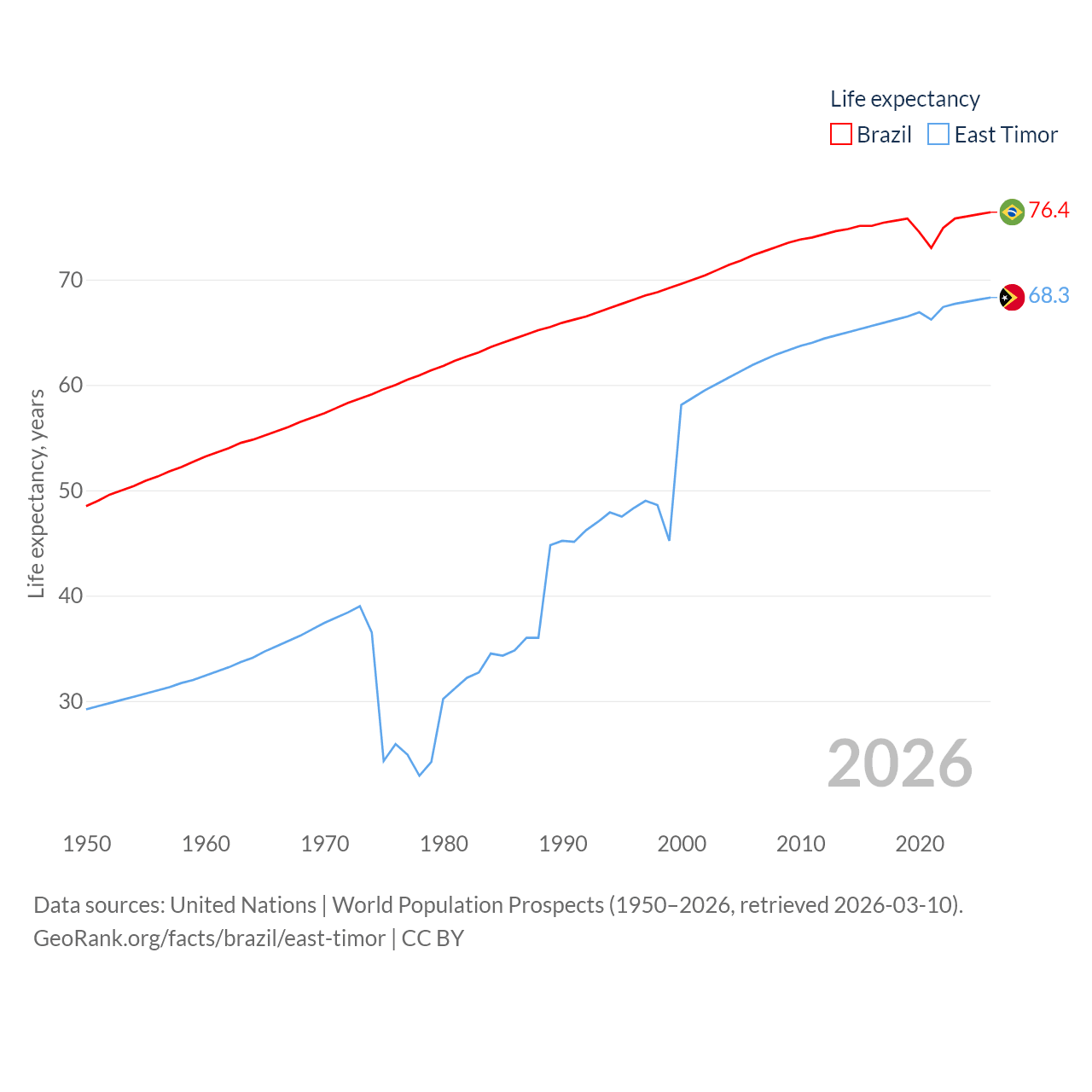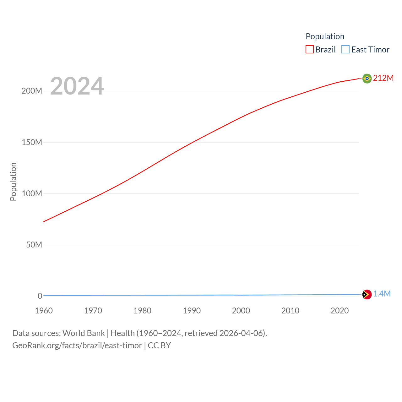 Brazil has a population of 212M (ranked 7/197), compared with 1.4M in East Timor (ranked 152/197). Brazil's land area is 3,227,096 sq mi versus 5,741 sq mi for East Timor (ranked 5th vs. 155th).