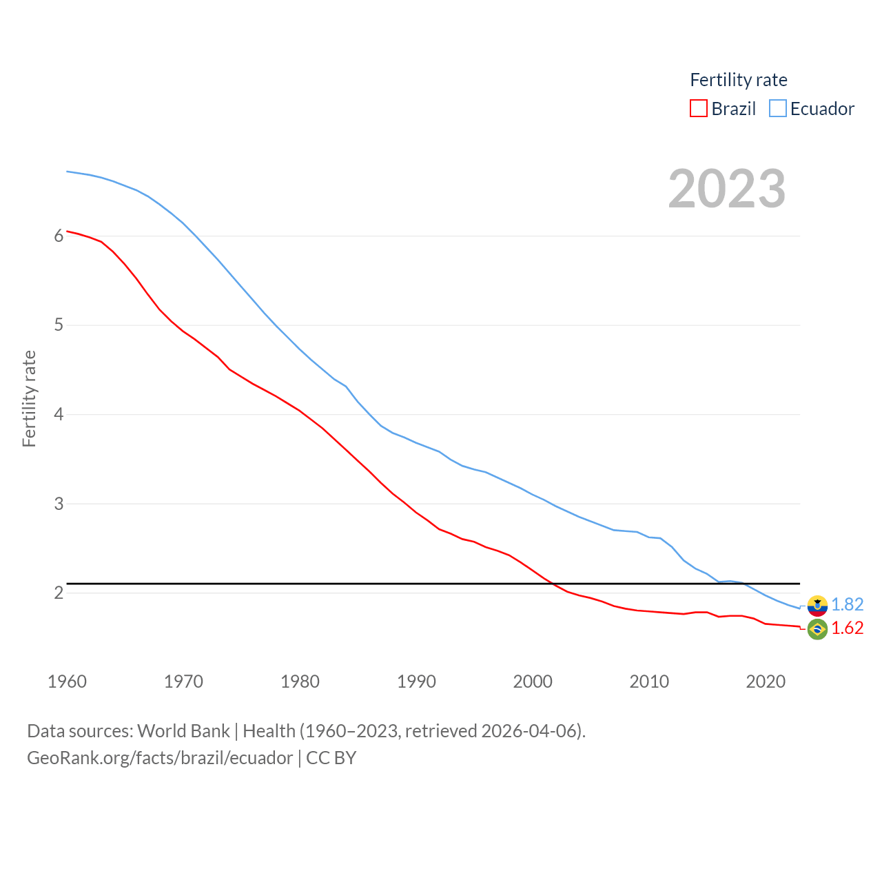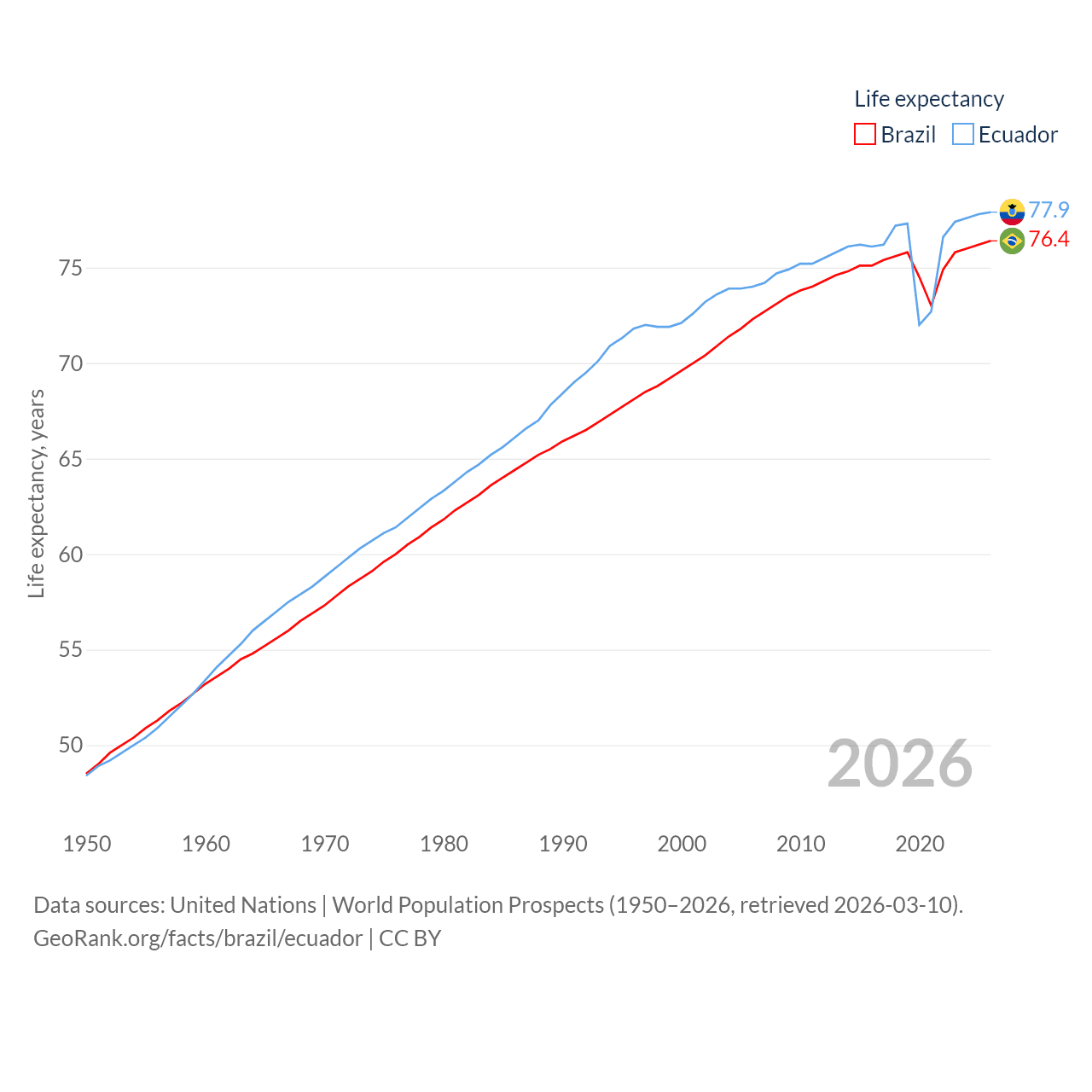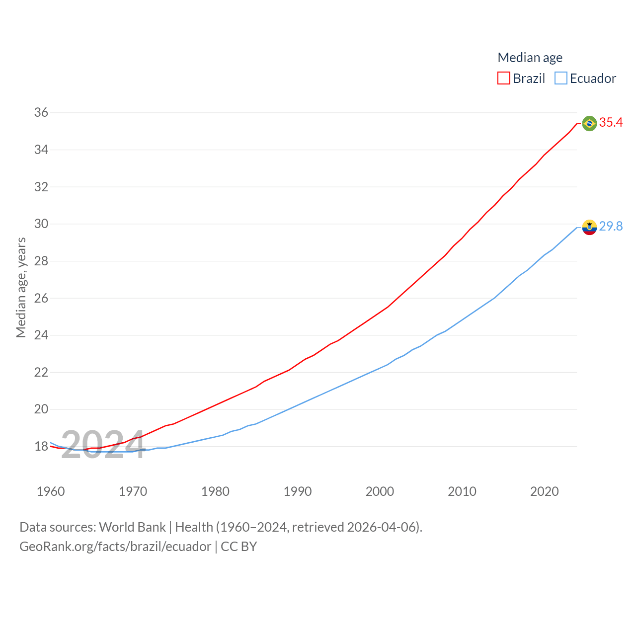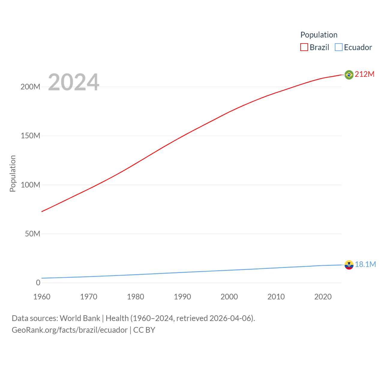 Brazil has a population of 212M (ranked 7/197), compared with 18.1M in Ecuador (ranked 71/197). Brazil's land area is 3,227,096 sq mi versus 95,892 sq mi for Ecuador (ranked 5th vs. 76th).