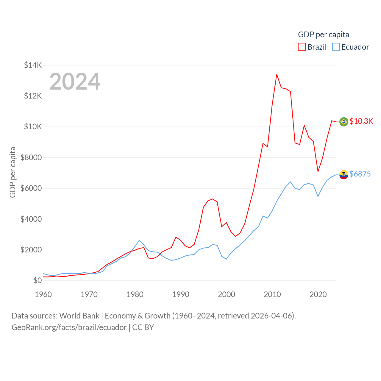 By GDP, Brazil ranks 10/197 ($2.19T) and Ecuador ranks 62/197 ($125B). By GDP per capita, Brazil ranks 85/197 ($10,311), while Ecuador ranks 103/197 ($6,875).