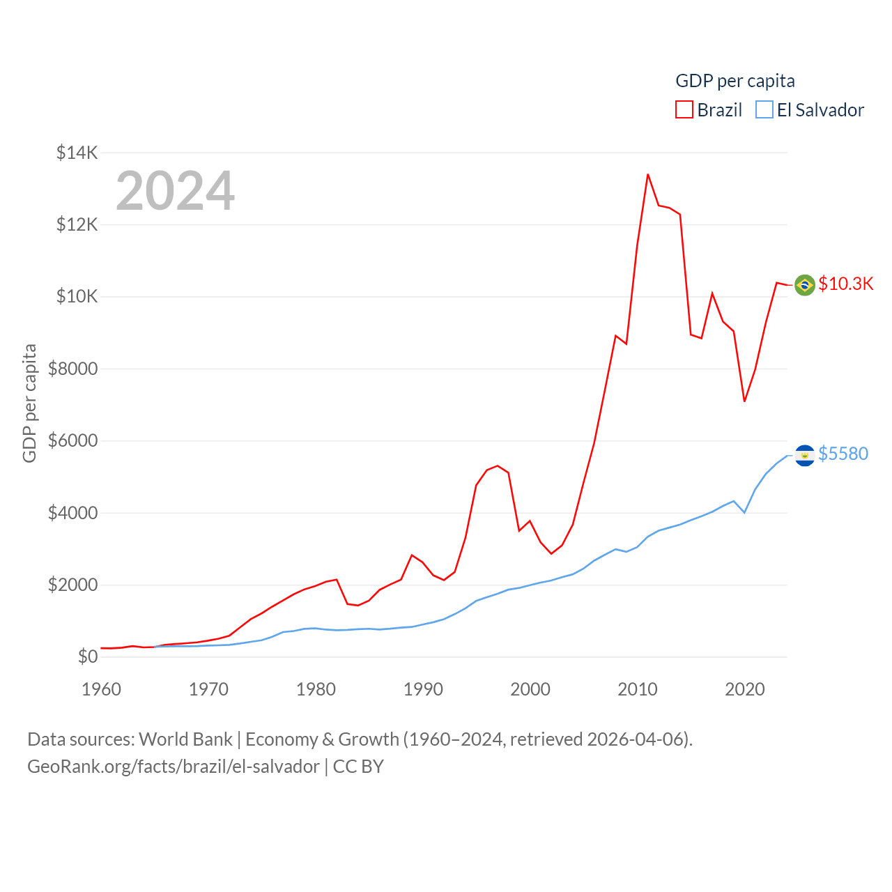By GDP, Brazil ranks 10/197 ($2.19T) and El Salvador ranks 105/197 ($35.4B). By GDP per capita, Brazil ranks 85/197 ($10,311), while El Salvador ranks 116/197 ($5,580).