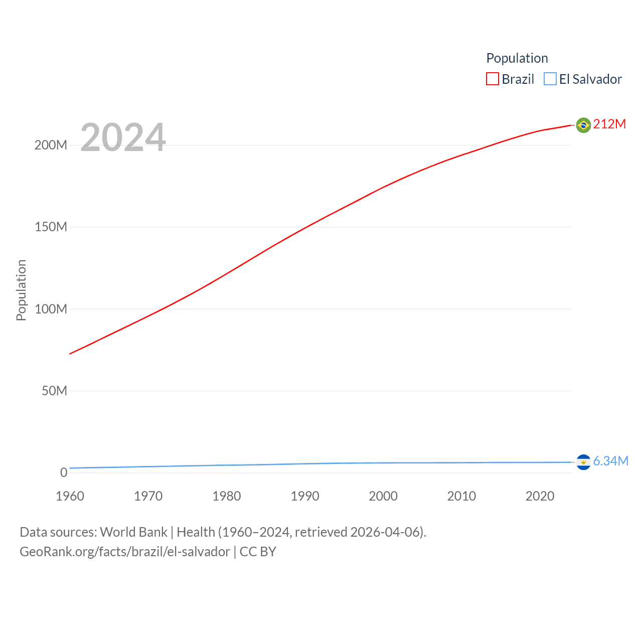 Brazil has a population of 212M (ranked 7/197), compared with 6.34M in El Salvador (ranked 111/197). Brazil's land area is 3,227,096 sq mi versus 8,000 sq mi for El Salvador (ranked 5th vs. 150th).