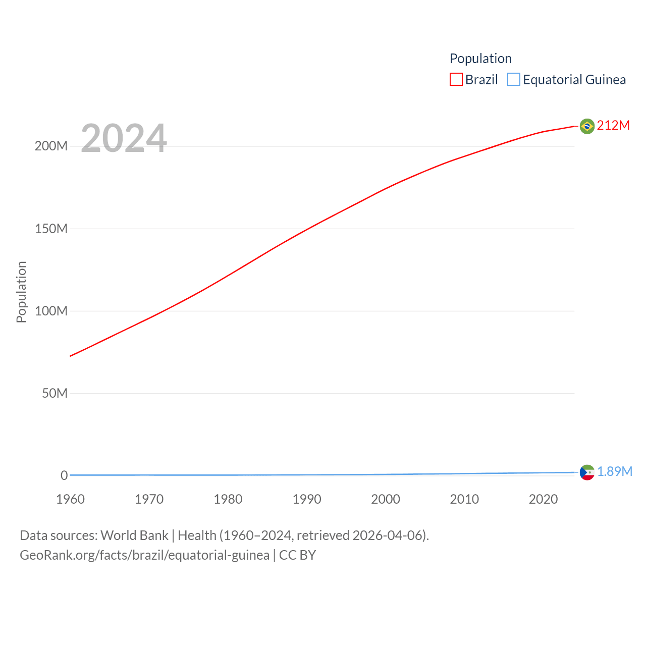 Brazil has a population of 212M (ranked 7/197), compared with 1.89M in Equatorial Guinea (ranked 148/197). Brazil's land area is 3,227,096 sq mi versus 10,830 sq mi for Equatorial Guinea (ranked 5th vs. 140th).
