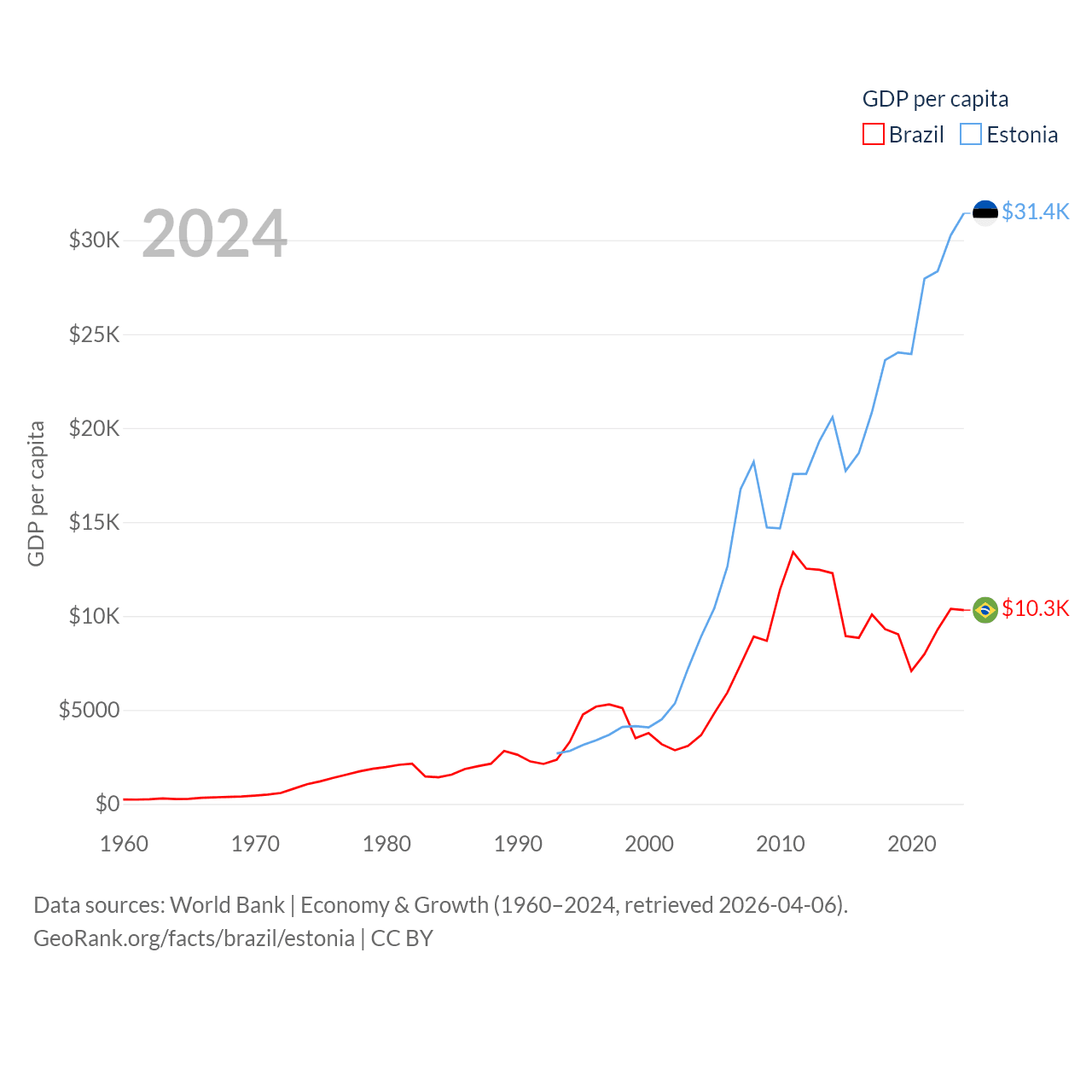 By GDP, Brazil ranks 10/197 ($2.19T) and Estonia ranks 100/197 ($43.1B). By GDP per capita, Brazil ranks 85/197 ($10,311), while Estonia ranks 40/197 ($31,428).