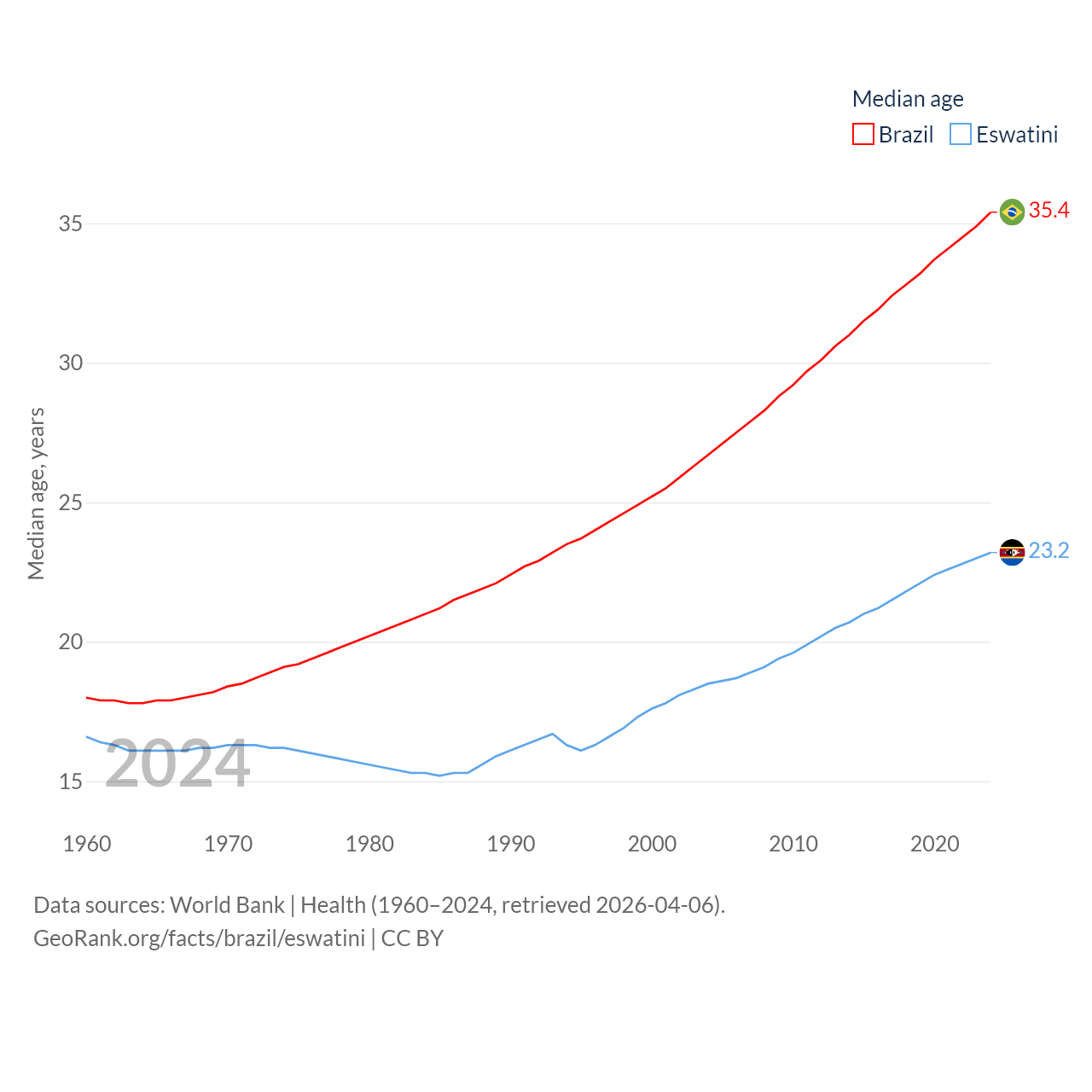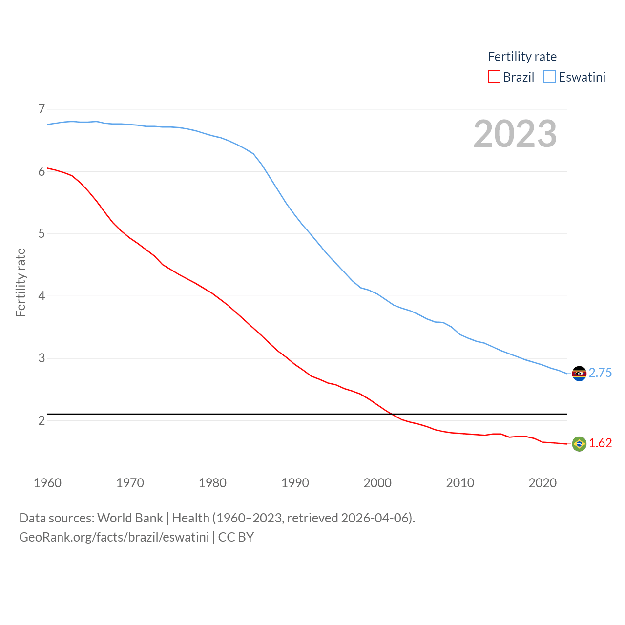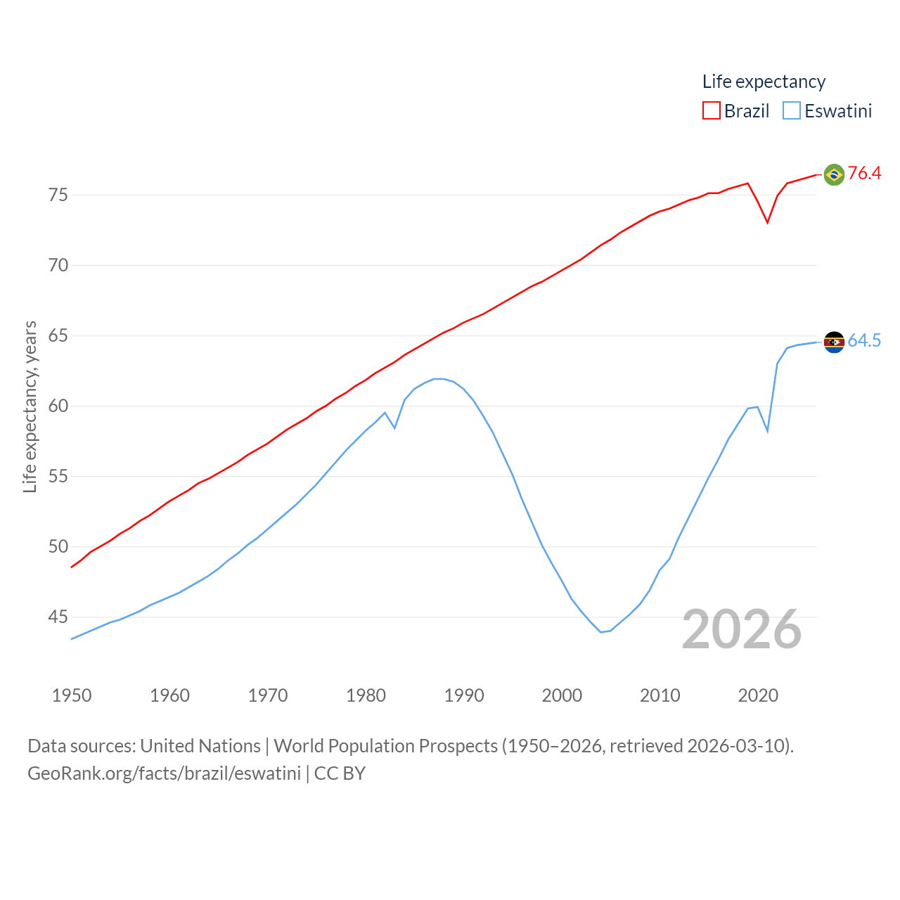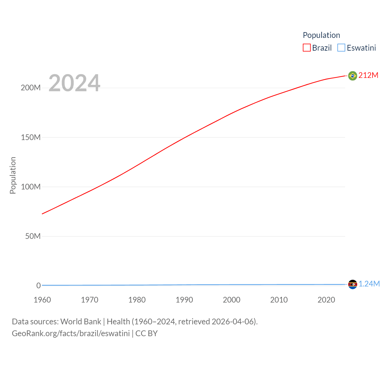 Brazil has a population of 212M (ranked 7/197), compared with 1.24M in Eswatini (ranked 157/197). Brazil's land area is 3,227,096 sq mi versus 6,641 sq mi for Eswatini (ranked 5th vs. 154th).