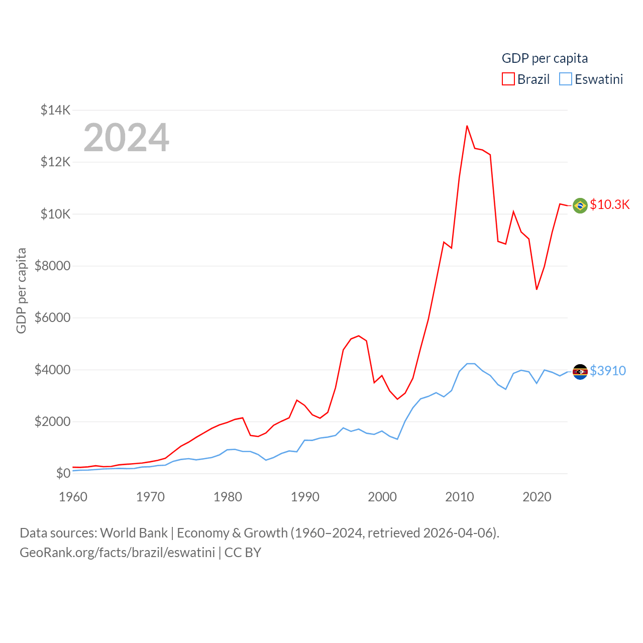 By GDP, Brazil ranks 10/197 ($2.19T) and Eswatini ranks 162/197 ($4.86B). By GDP per capita, Brazil ranks 85/197 ($10,311), while Eswatini ranks 131/197 ($3,910).