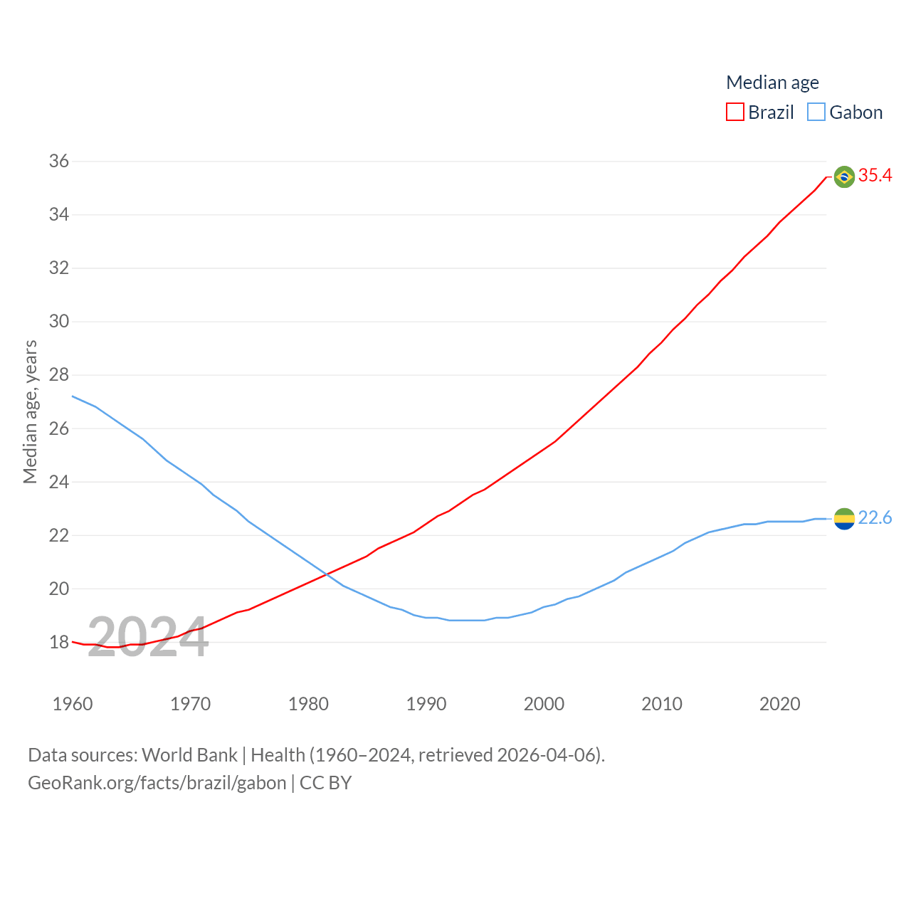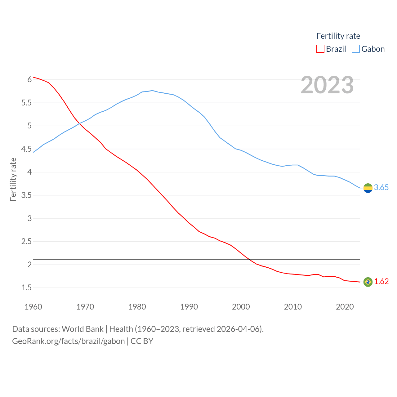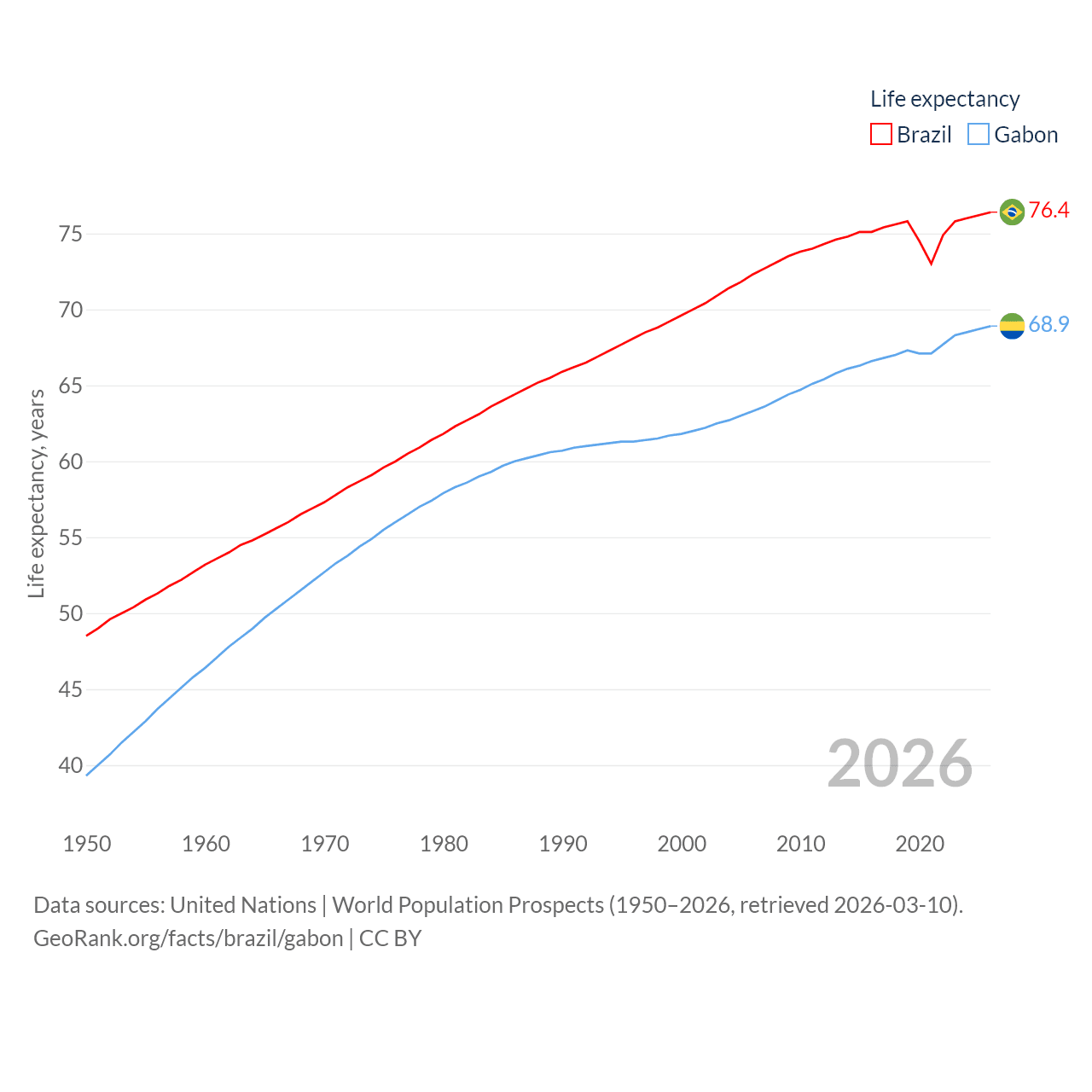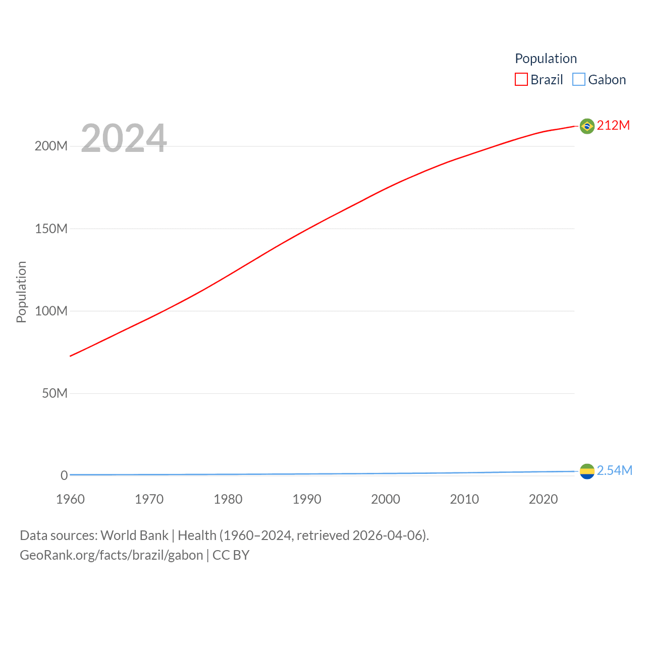 Brazil has a population of 212M (ranked 7/197), compared with 2.54M in Gabon (ranked 141/197). Brazil's land area is 3,227,096 sq mi versus 99,487 sq mi for Gabon (ranked 5th vs. 75th).