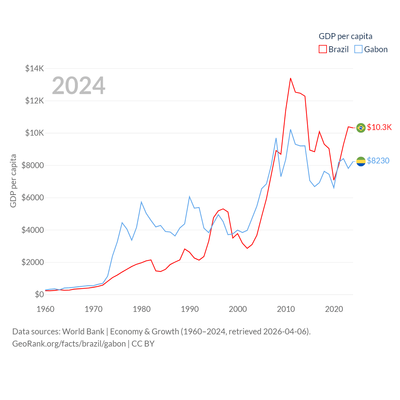 By GDP, Brazil ranks 10/197 ($2.19T) and Gabon ranks 127/197 ($20.9B). By GDP per capita, Brazil ranks 85/197 ($10,311), while Gabon ranks 93/197 ($8,230).
