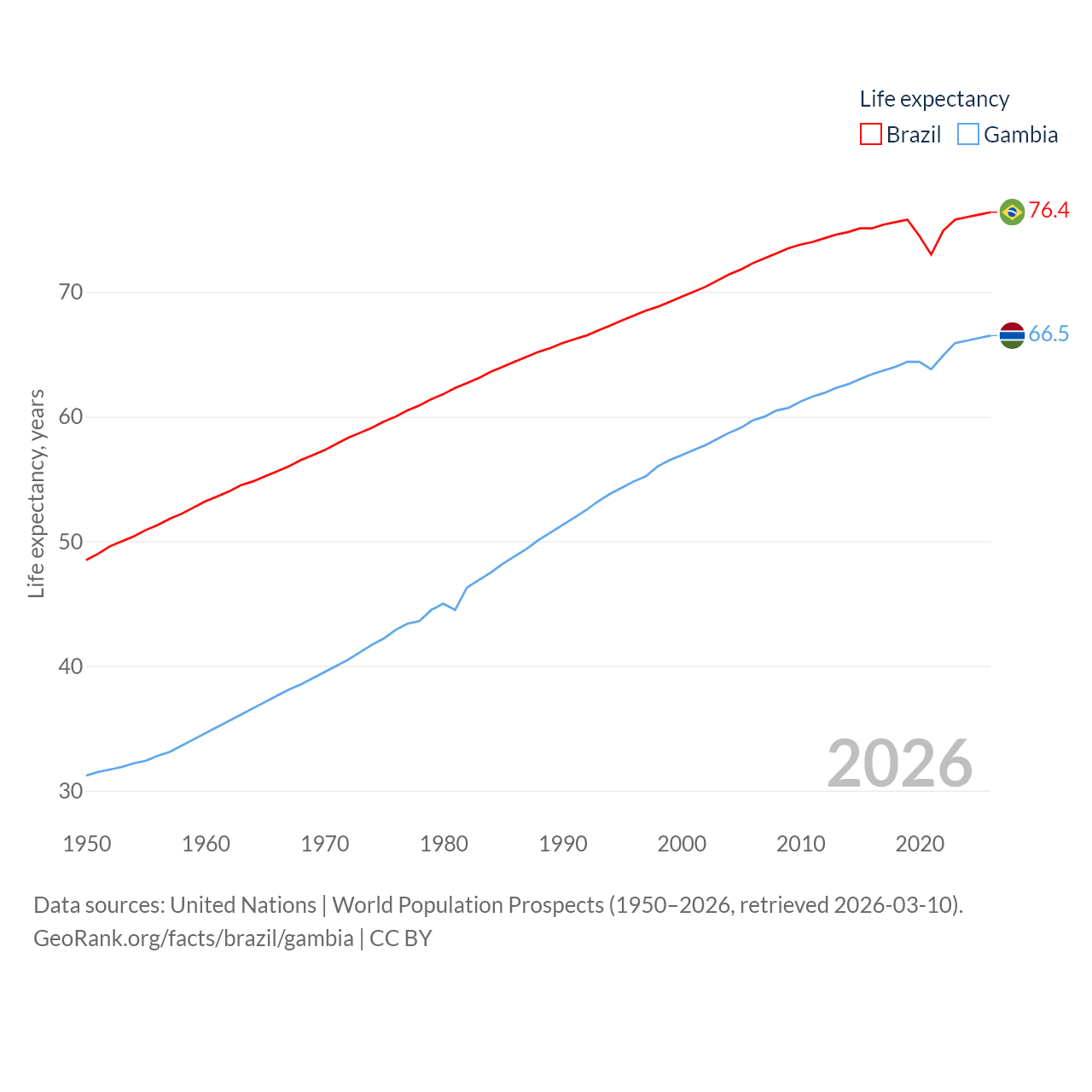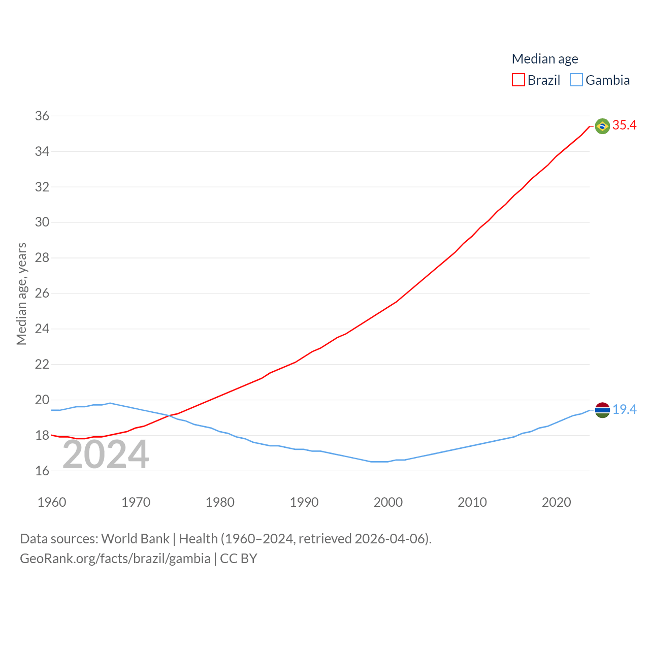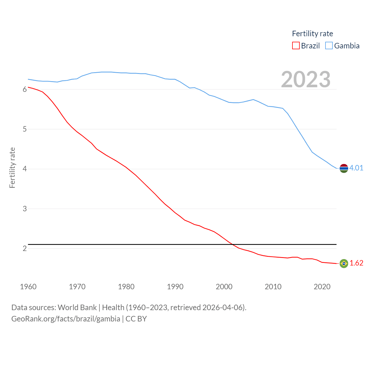 Brazil has a population of 212M (ranked 7/197), compared with 2.76M in The Gambia (ranked 140/197). Brazil's land area is 3,227,096 sq mi versus 3,907 sq mi for The Gambia (ranked 5th vs. 161st).
