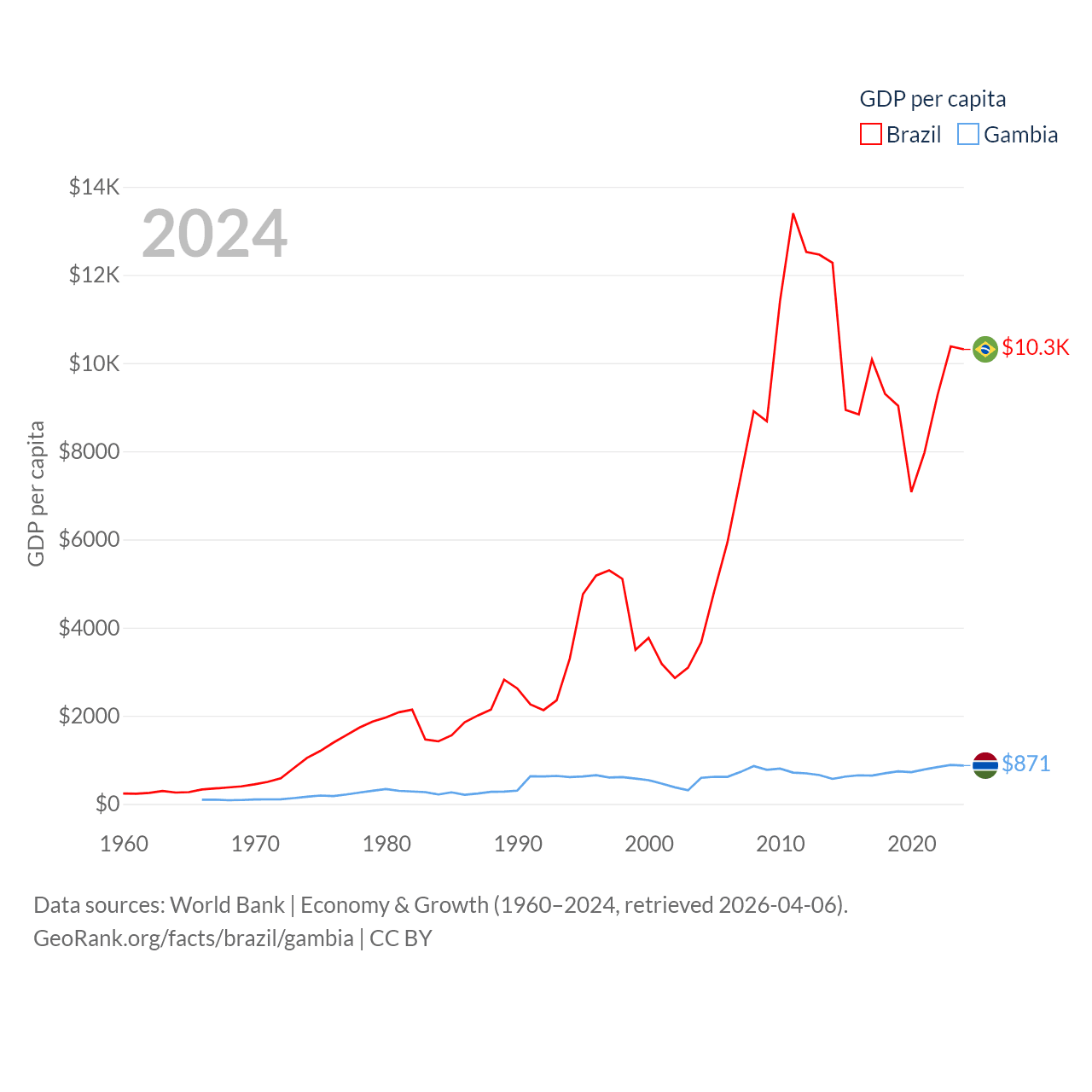 By GDP, Brazil ranks 10/197 ($2.19T) and The Gambia ranks 174/197 ($2.4B). By GDP per capita, Brazil ranks 85/197 ($10,311), while The Gambia ranks 183/197 ($871).