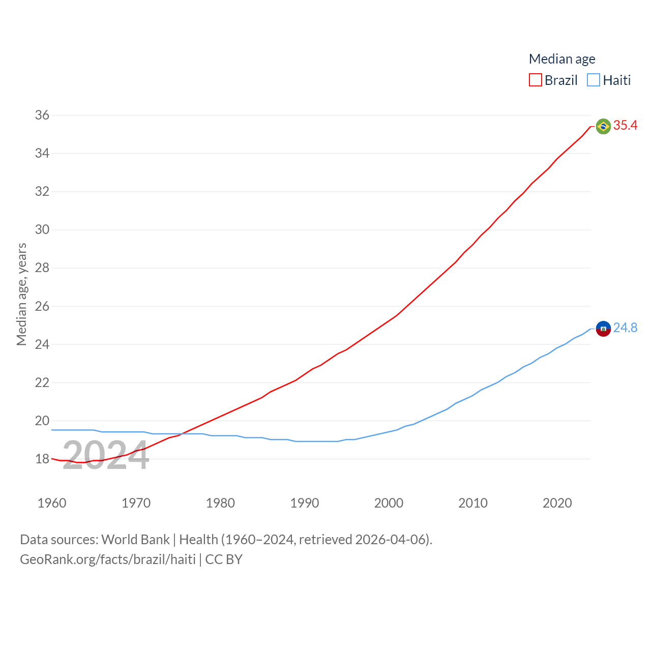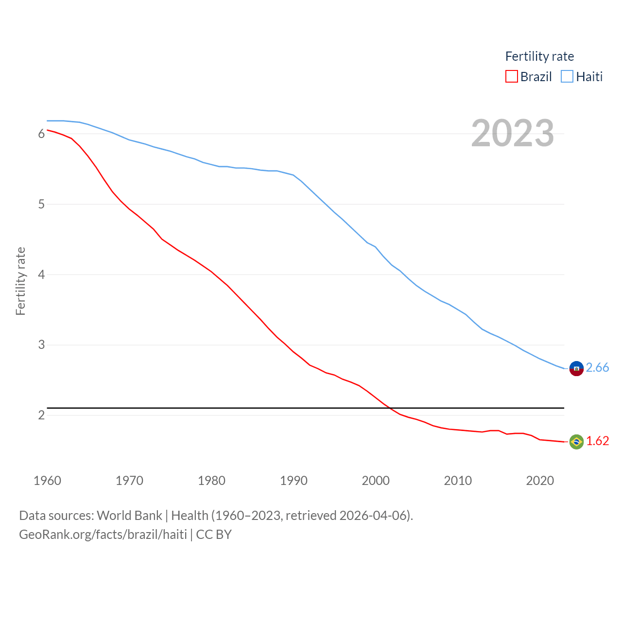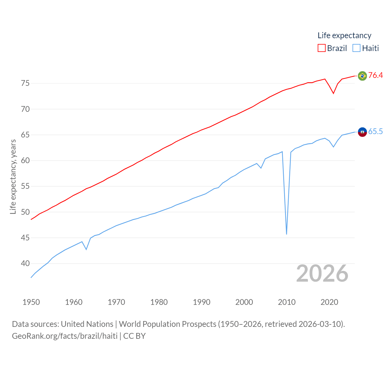 Brazil has a population of 212M (ranked 7/197), compared with 11.8M in Haiti (ranked 83/197). Brazil's land area is 3,227,096 sq mi versus 10,641 sq mi for Haiti (ranked 5th vs. 142nd).