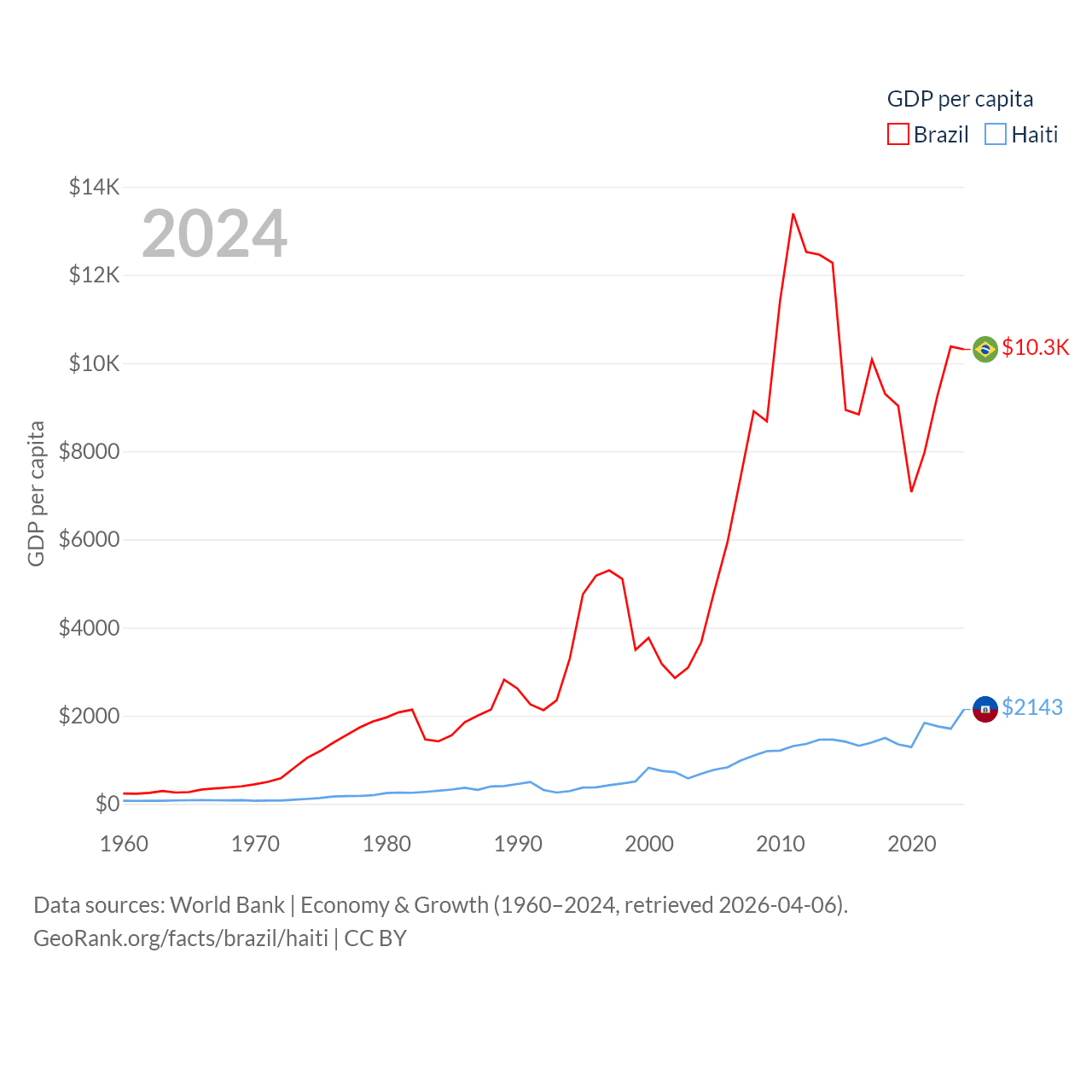By GDP, Brazil ranks 10/197 ($2.19T) and Haiti ranks 117/197 ($25.2B). By GDP per capita, Brazil ranks 85/197 ($10,311), while Haiti ranks 153/197 ($2,143).
