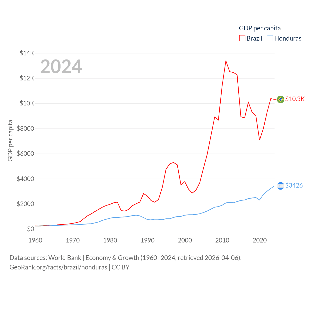 By GDP, Brazil ranks 10/197 ($2.19T) and Honduras ranks 104/197 ($37.1B). By GDP per capita, Brazil ranks 85/197 ($10,311), while Honduras ranks 136/197 ($3,426).