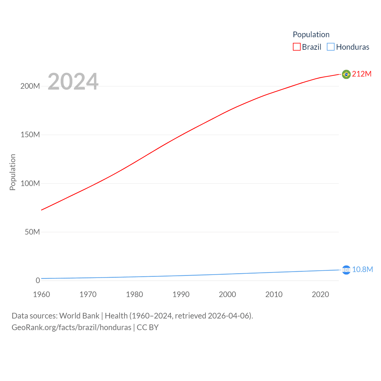 Brazil has a population of 212M (ranked 7/197), compared with 10.8M in Honduras (ranked 89/197). Brazil's land area is 3,227,096 sq mi versus 43,201 sq mi for Honduras (ranked 5th vs. 100th).