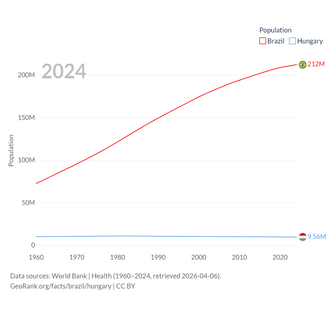 Brazil has a population of 212M (ranked 7/197), compared with 9.56M in Hungary (ranked 97/197). Brazil's land area is 3,227,096 sq mi versus 35,236 sq mi for Hungary (ranked 5th vs. 109th).
