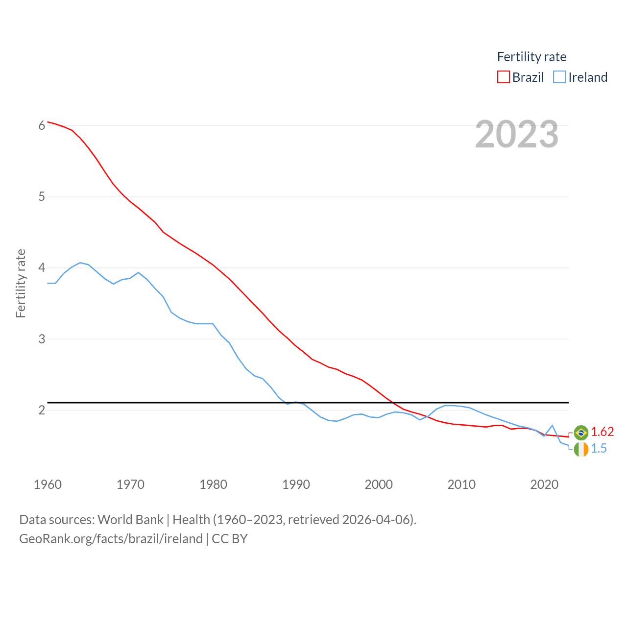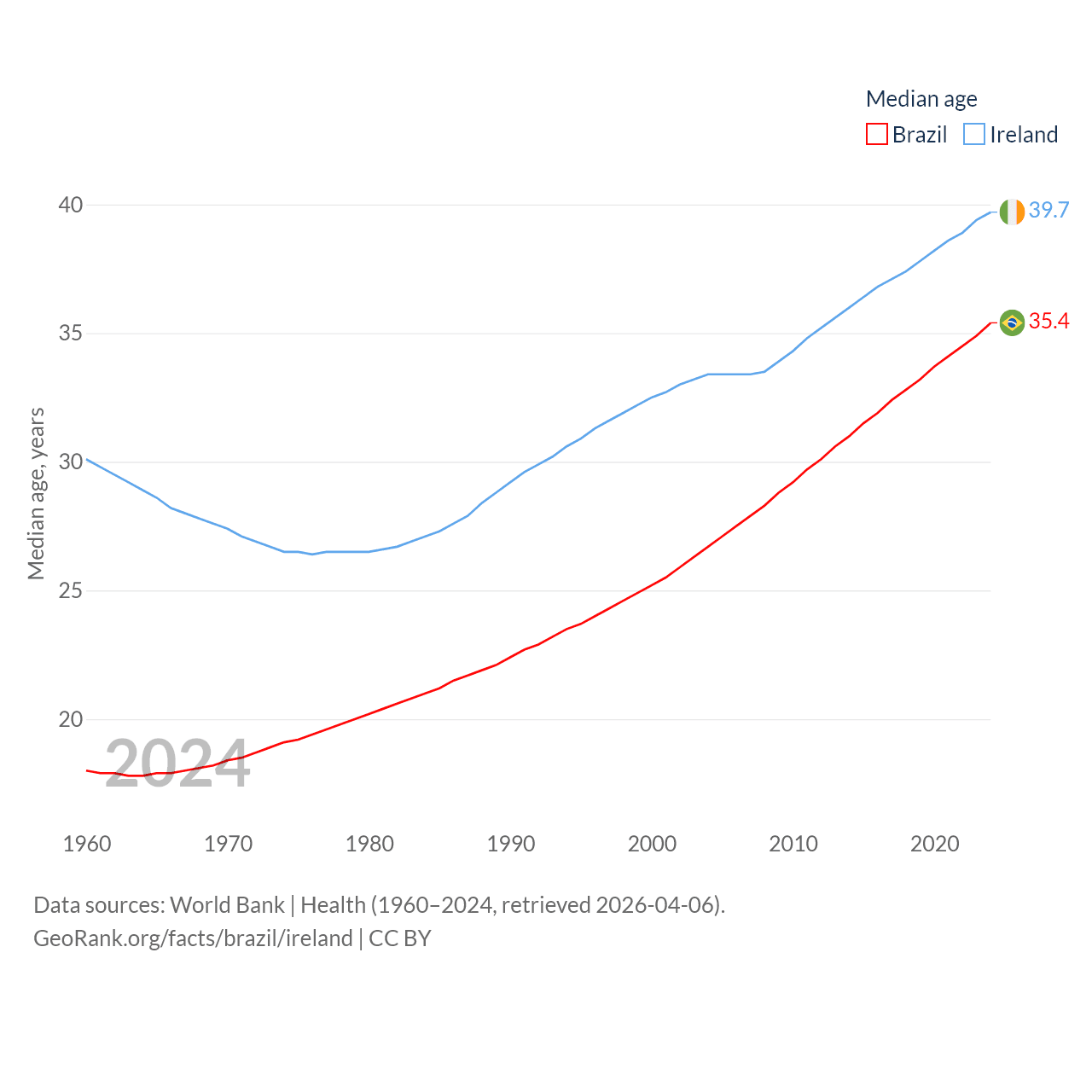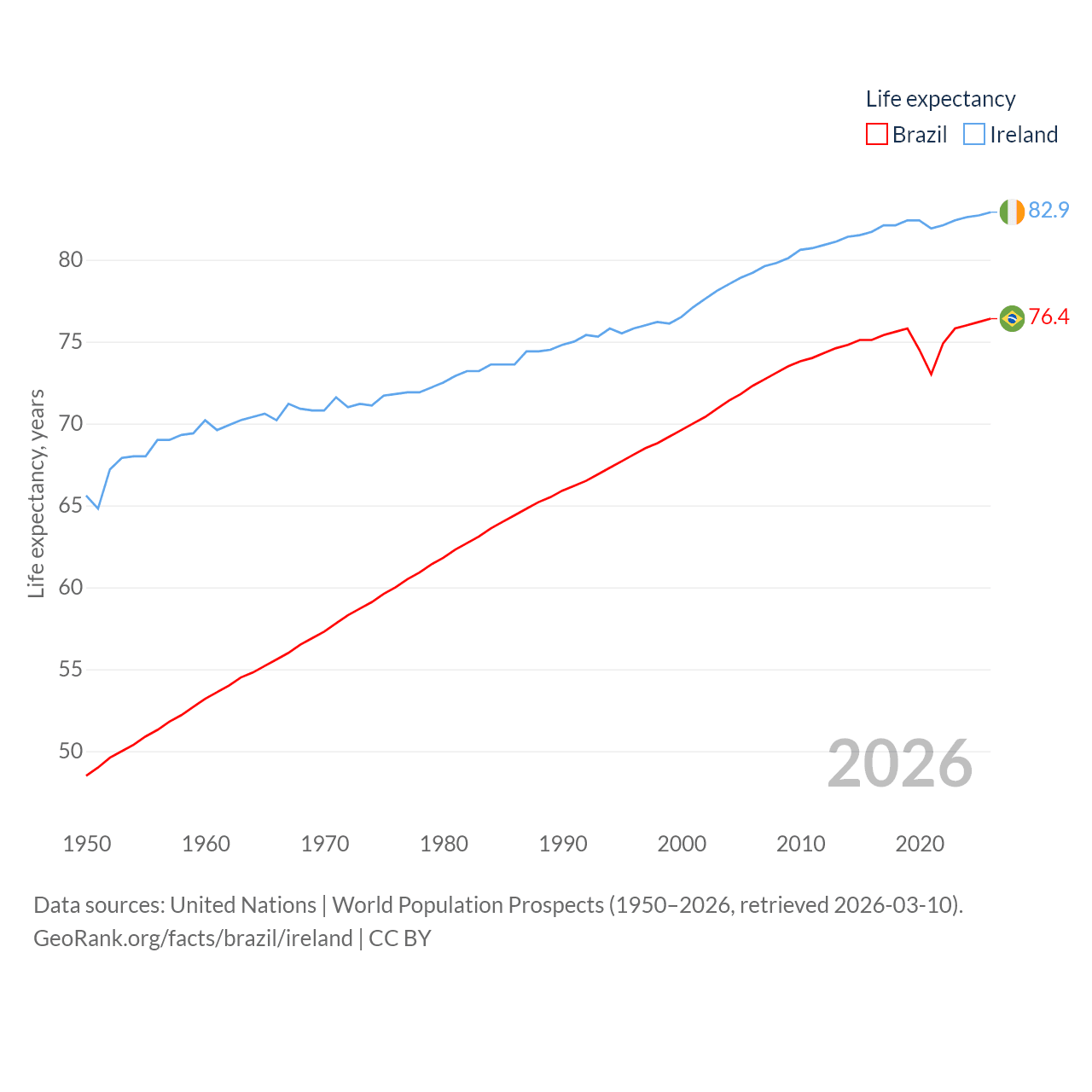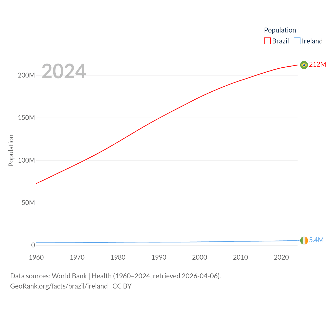 Brazil has a population of 212M (ranked 7/197), compared with 5.4M in Ireland (ranked 120/197). Brazil's land area is 3,227,096 sq mi versus 26,599 sq mi for Ireland (ranked 5th vs. 119th).