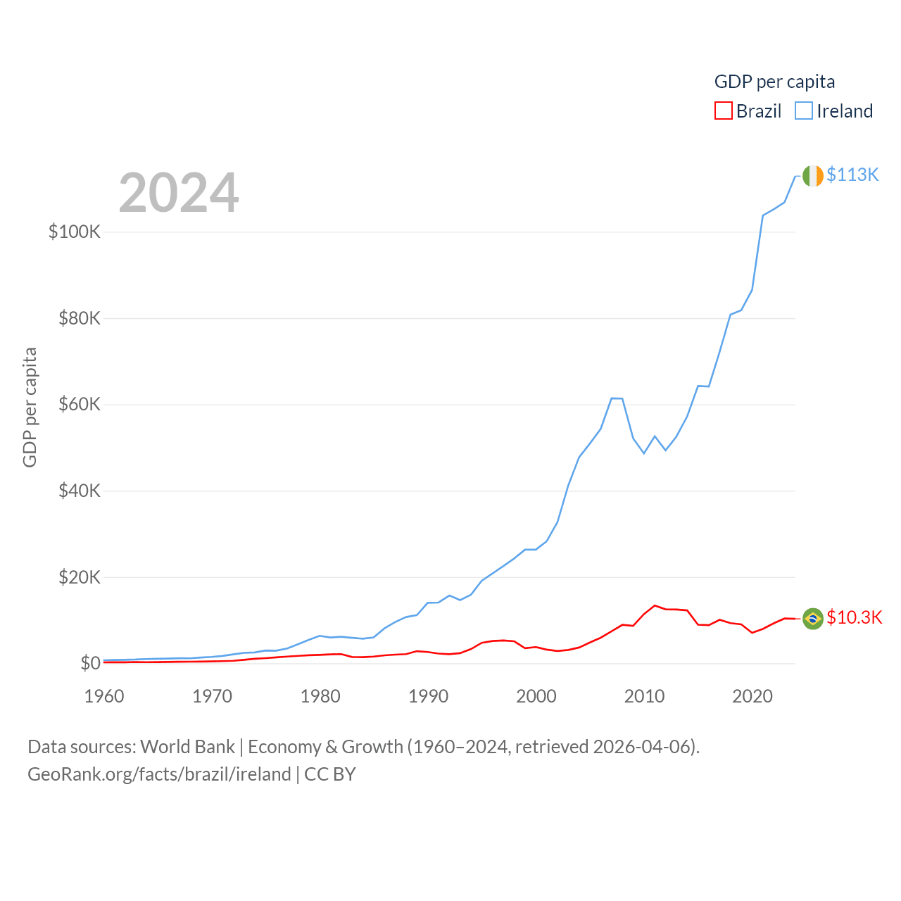 By GDP, Brazil ranks 10/197 ($2.19T) and Ireland ranks 25/197 ($609B). By GDP per capita, Brazil ranks 85/197 ($10,311), while Ireland ranks 4/197 ($112,895).