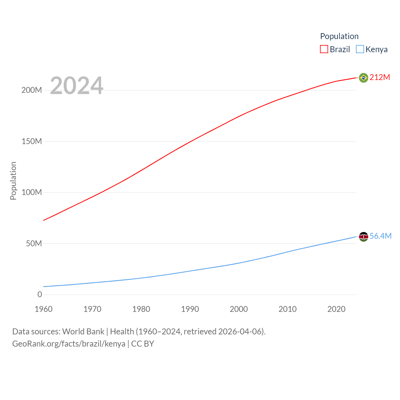 Brazil has a population of 212M (ranked 7/197), compared with 56.4M in Kenya (ranked 26/197). Brazil's land area is 3,227,096 sq mi versus 224,278 sq mi for Kenya (ranked 5th vs. 45th).