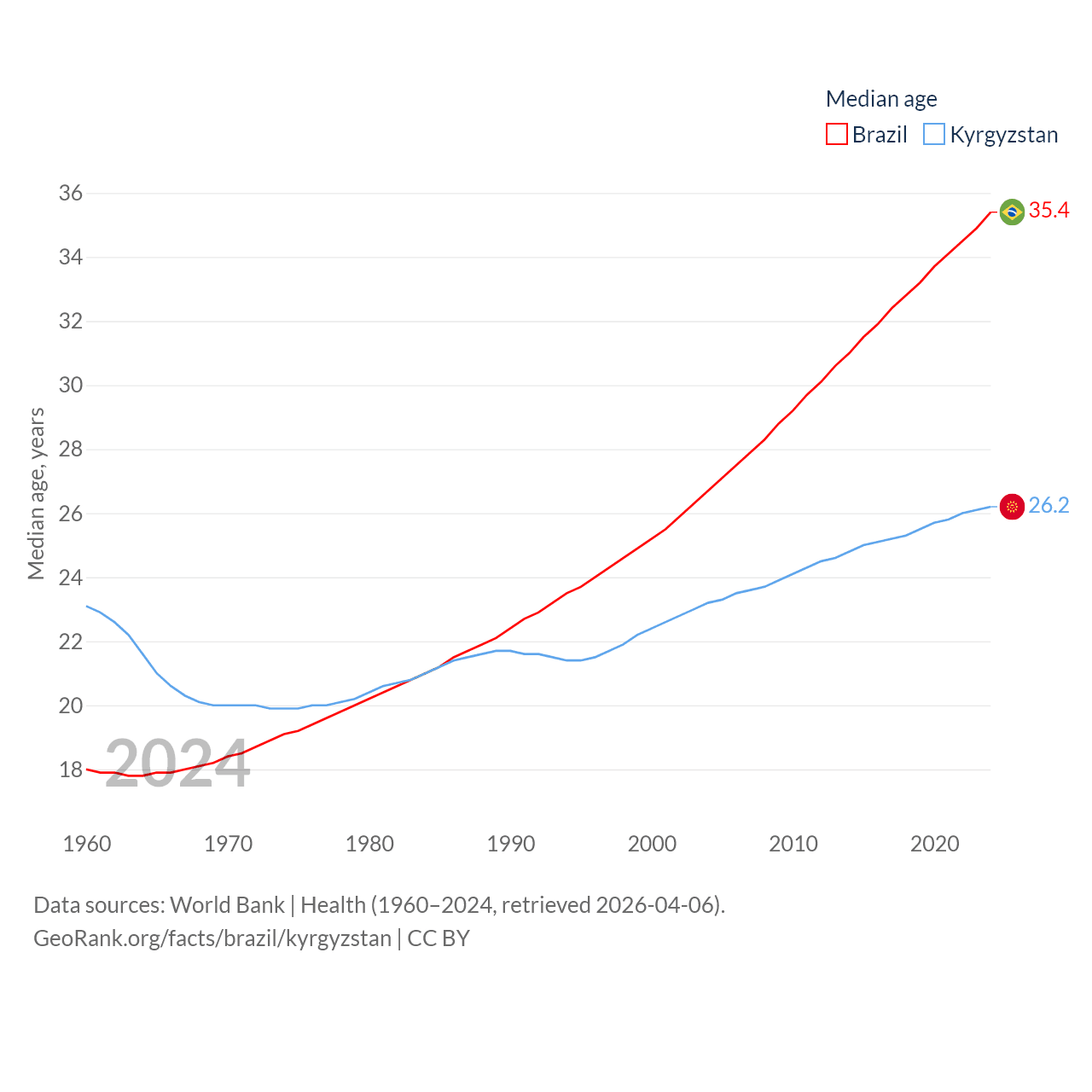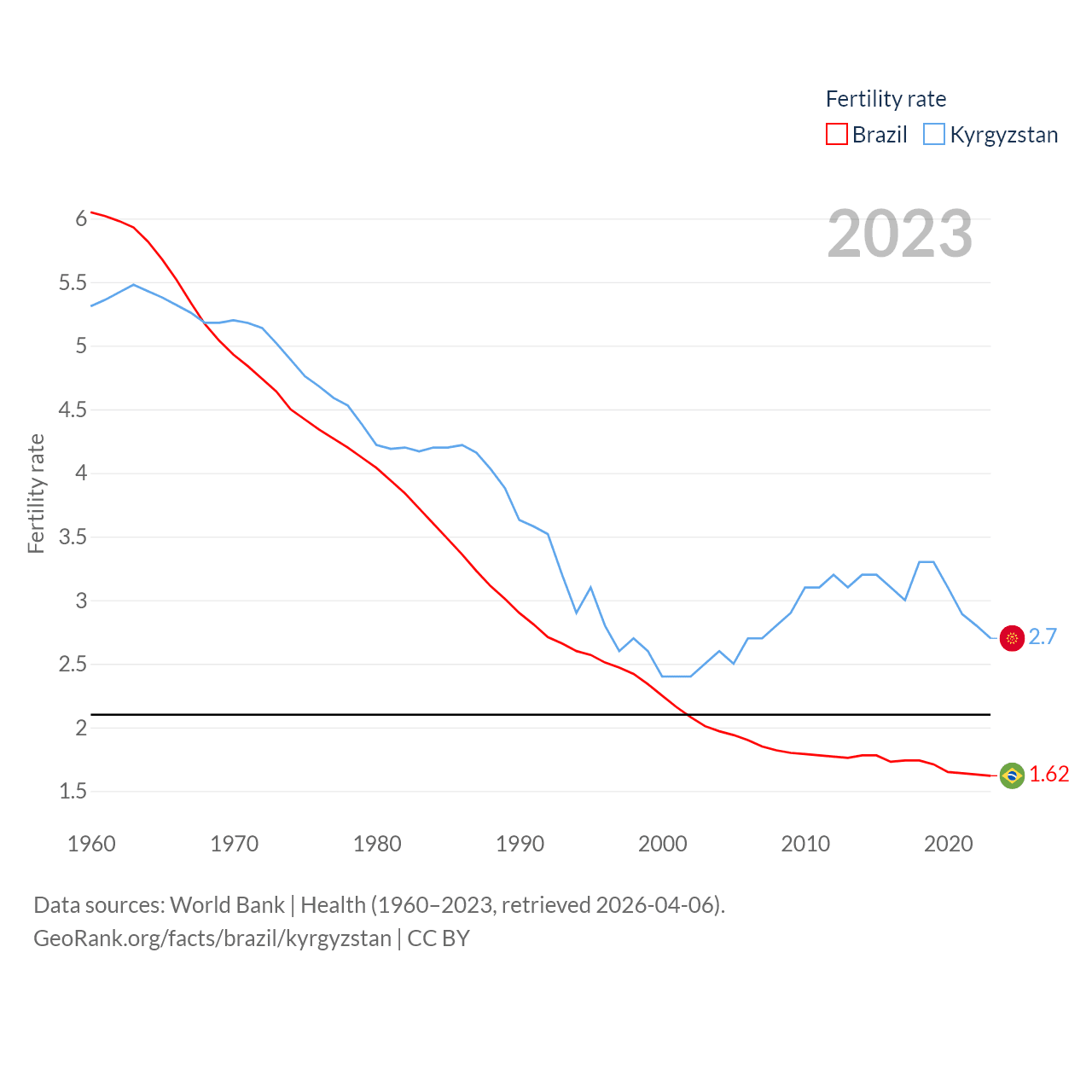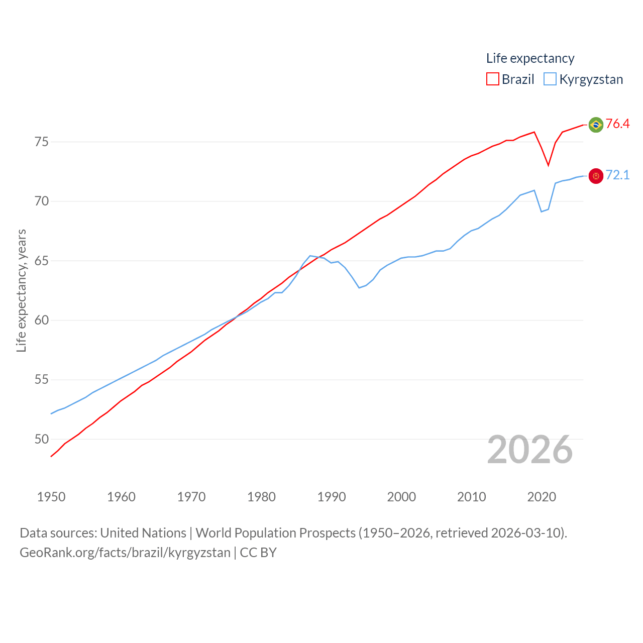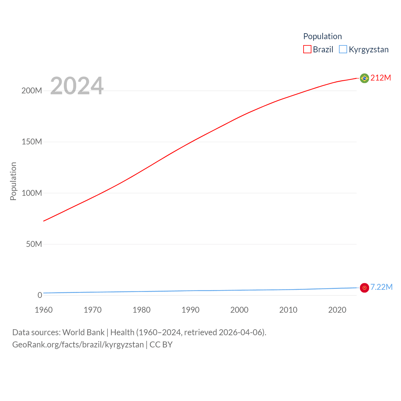 Brazil has a population of 212M (ranked 7/197), compared with 7.22M in Kyrgyzstan (ranked 106/197). Brazil's land area is 3,227,096 sq mi versus 74,054 sq mi for Kyrgyzstan (ranked 5th vs. 86th).