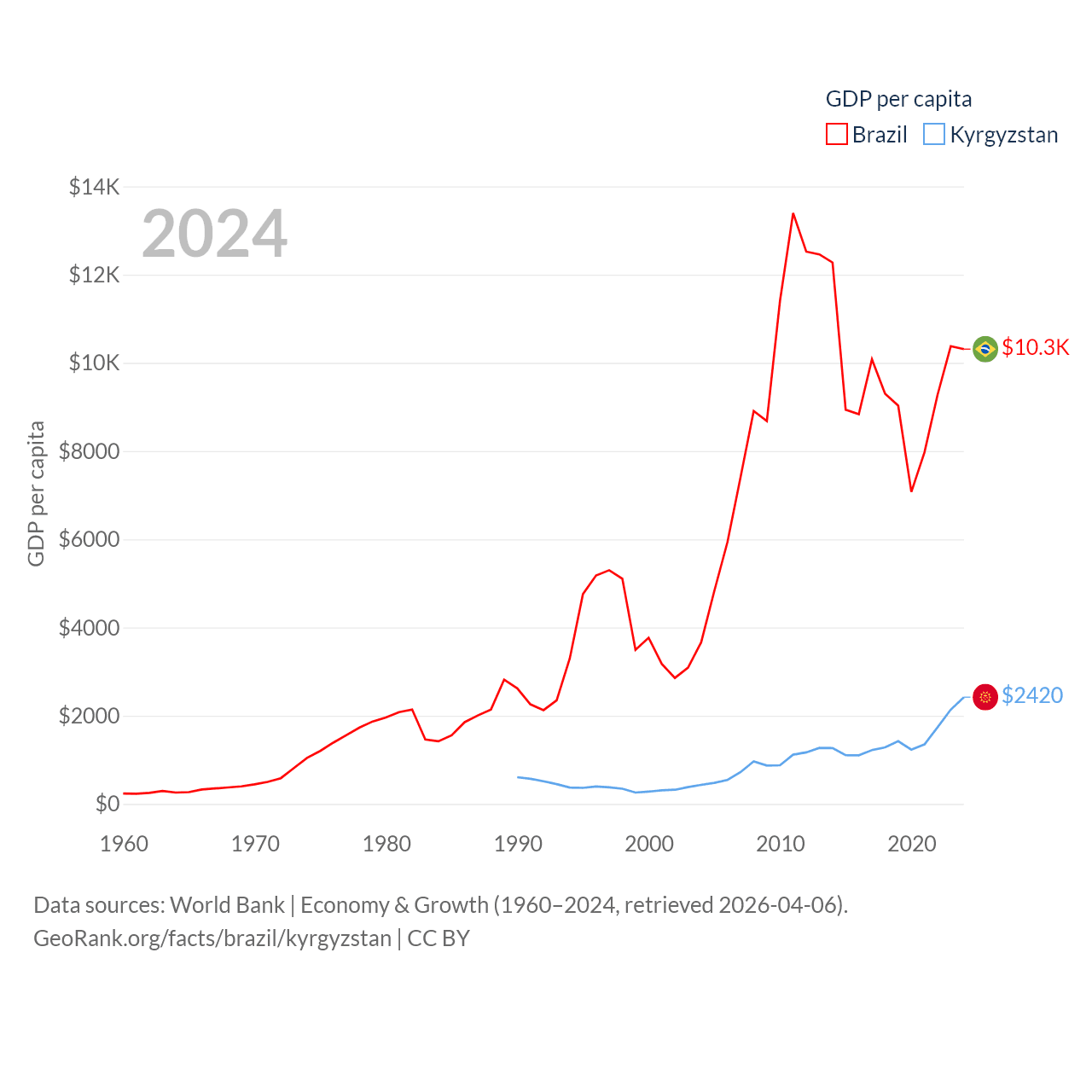 By GDP, Brazil ranks 10/197 ($2.19T) and Kyrgyzstan ranks 135/197 ($17.5B). By GDP per capita, Brazil ranks 85/197 ($10,311), while Kyrgyzstan ranks 150/197 ($2,420).