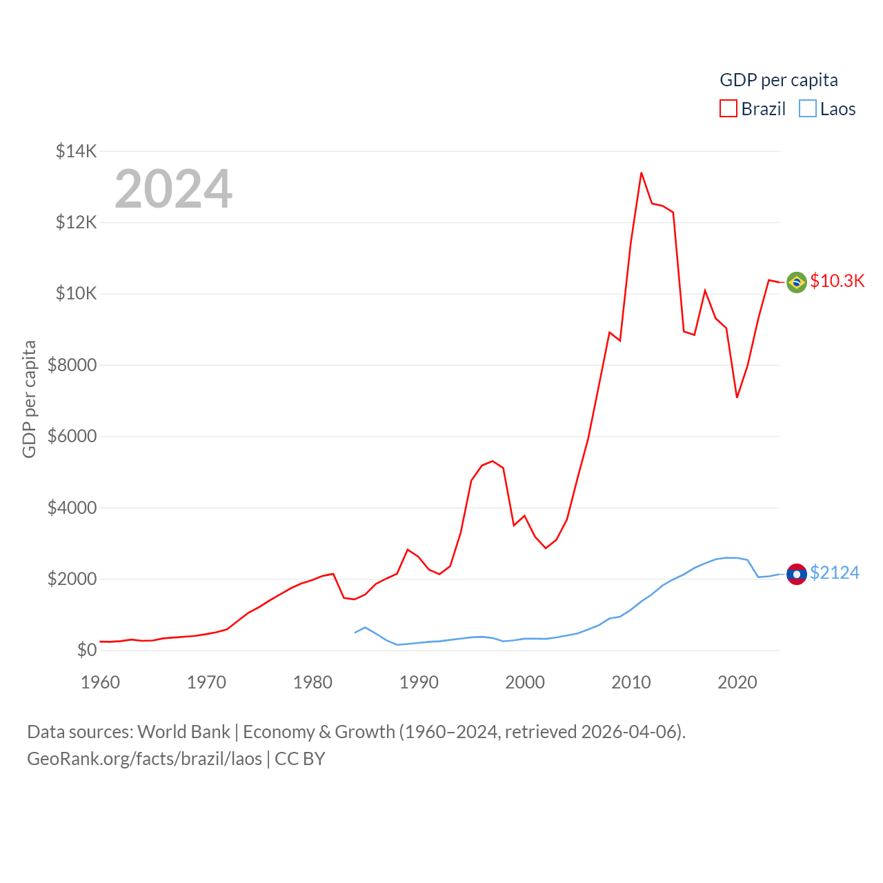 By GDP, Brazil ranks 10/197 ($2.19T) and Laos ranks 139/197 ($16.5B). By GDP per capita, Brazil ranks 85/197 ($10,311), while Laos ranks 155/197 ($2,124).