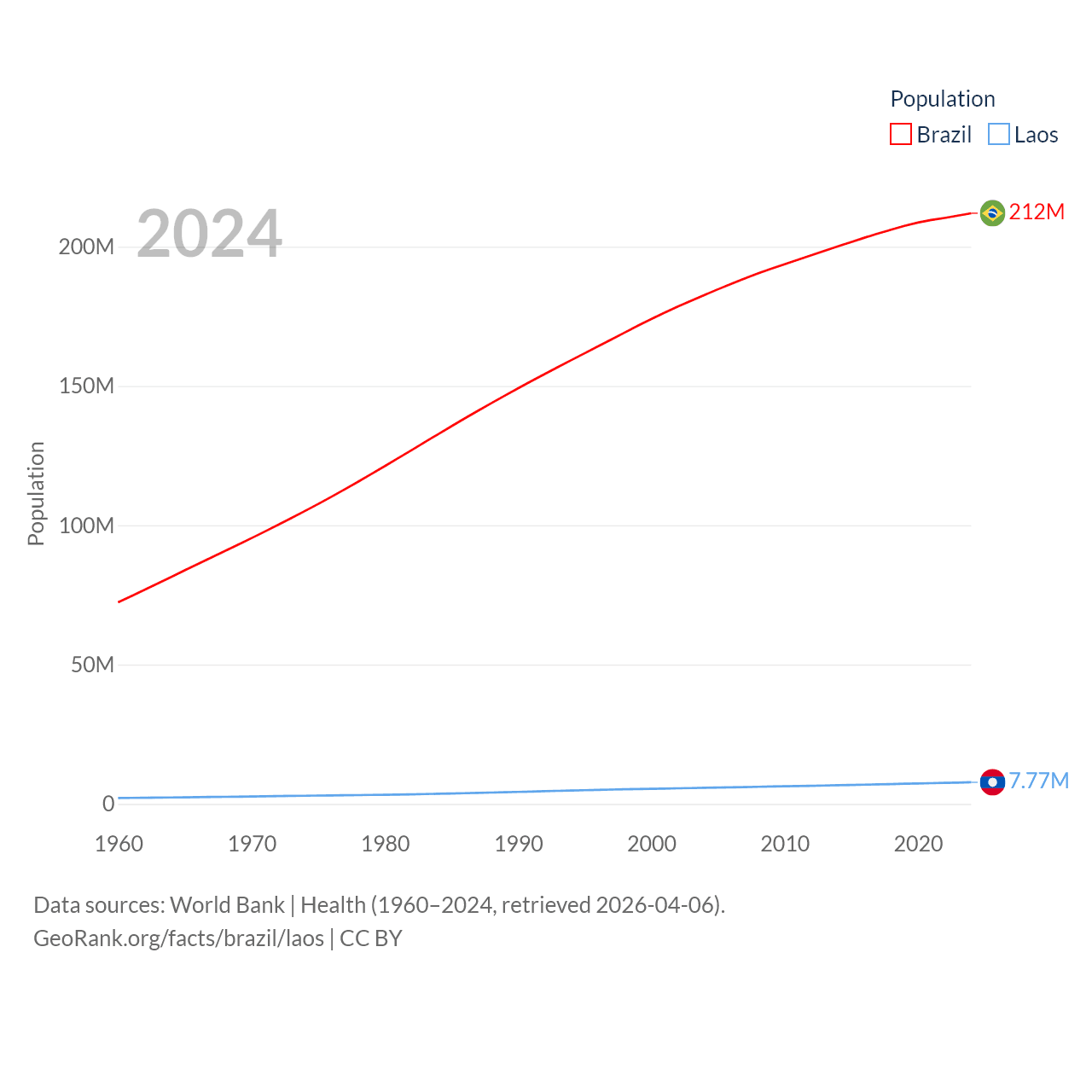 Brazil has a population of 212M (ranked 7/197), compared with 7.77M in Laos (ranked 103/197). Brazil's land area is 3,227,096 sq mi versus 89,112 sq mi for Laos (ranked 5th vs. 79th).
