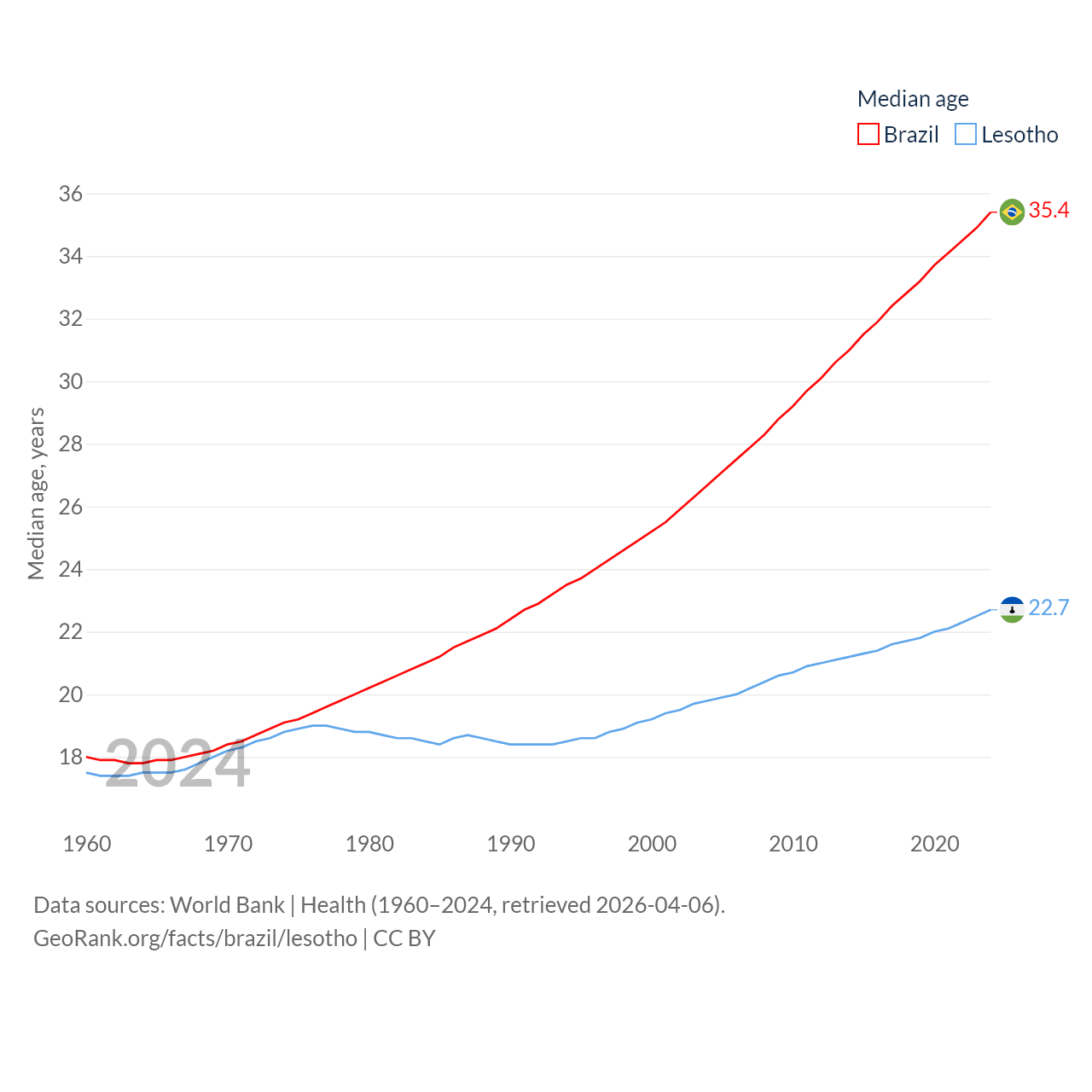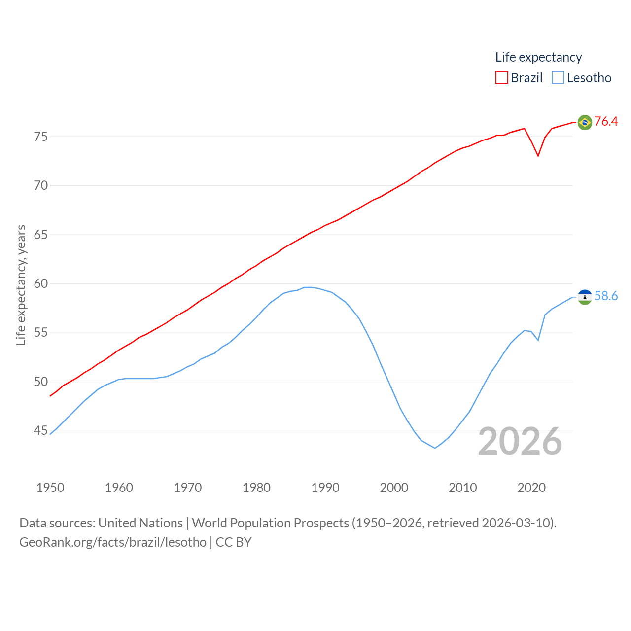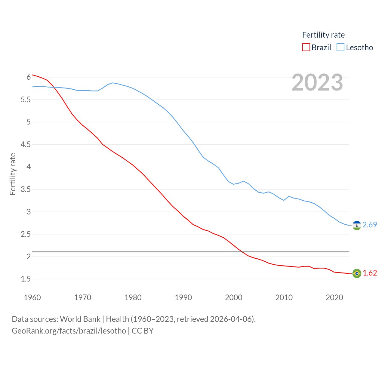 Brazil has a population of 212M (ranked 7/197), compared with 2.34M in Lesotho (ranked 145/197). Brazil's land area is 3,227,096 sq mi versus 11,722 sq mi for Lesotho (ranked 5th vs. 137th).