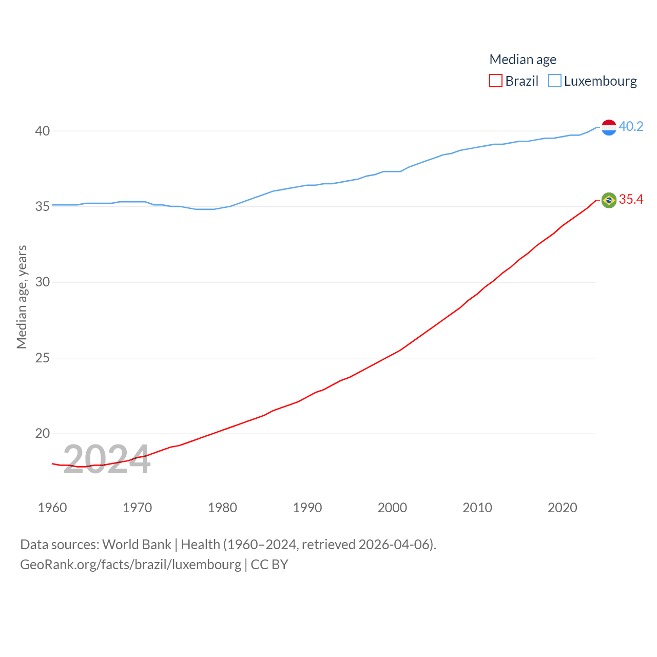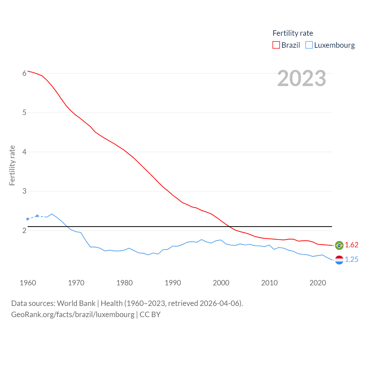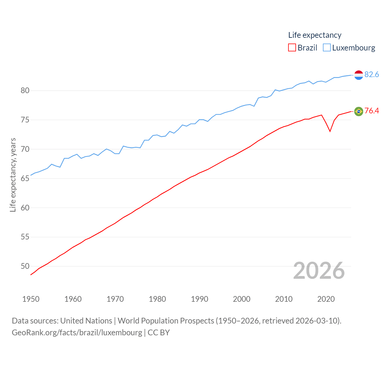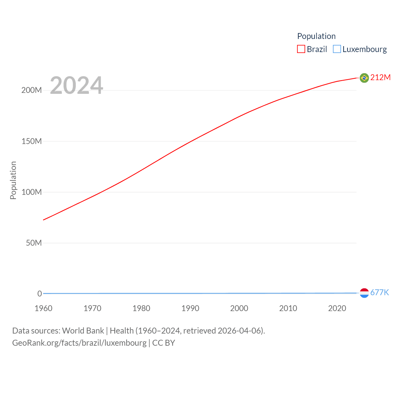 Brazil has a population of 212M (ranked 7/197), compared with 677K in Luxembourg (ranked 164/197). Brazil's land area is 3,227,096 sq mi versus 994 sq mi for Luxembourg (ranked 5th vs. 169th).