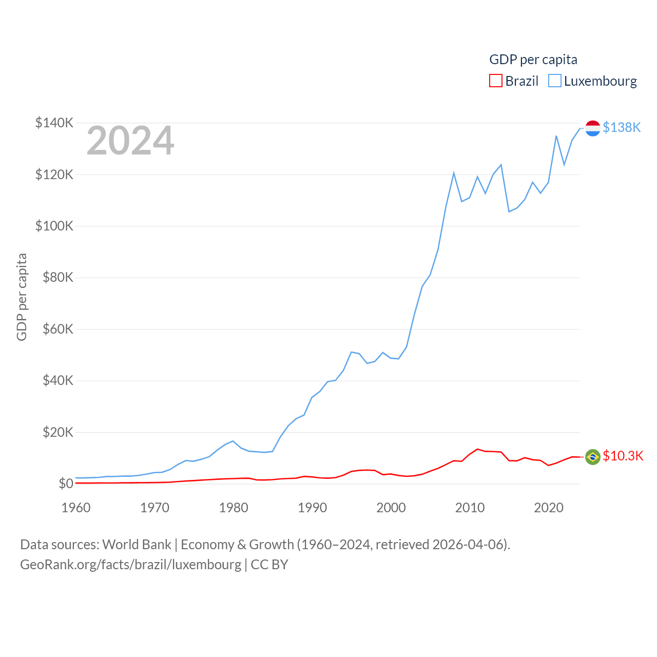 By GDP, Brazil ranks 10/197 ($2.19T) and Luxembourg ranks 74/197 ($93.3B). By GDP per capita, Brazil ranks 85/197 ($10,311), while Luxembourg ranks 3/197 ($137,782).