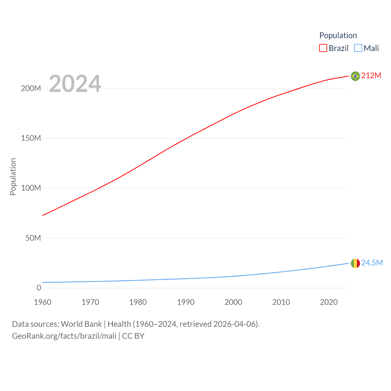 Brazil has a population of 212M (ranked 7/197), compared with 24.5M in Mali (ranked 58/197). Brazil's land area is 3,227,096 sq mi versus 471,118 sq mi for Mali (ranked 5th vs. 23rd).