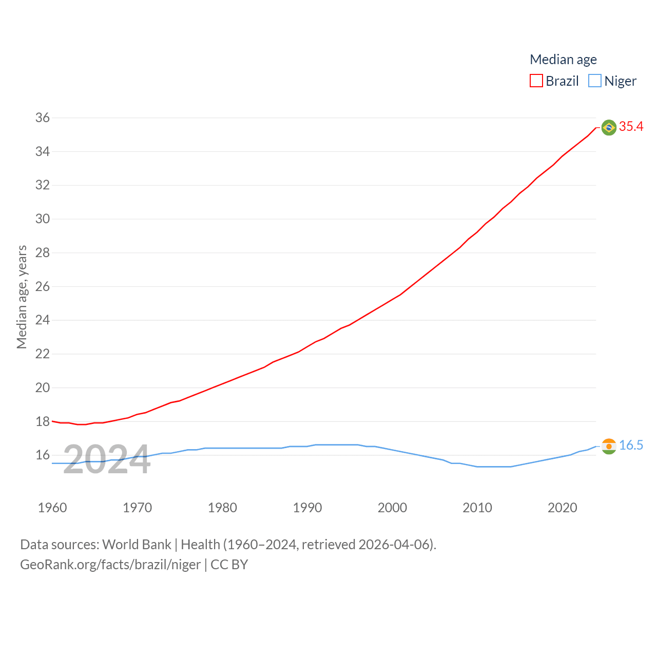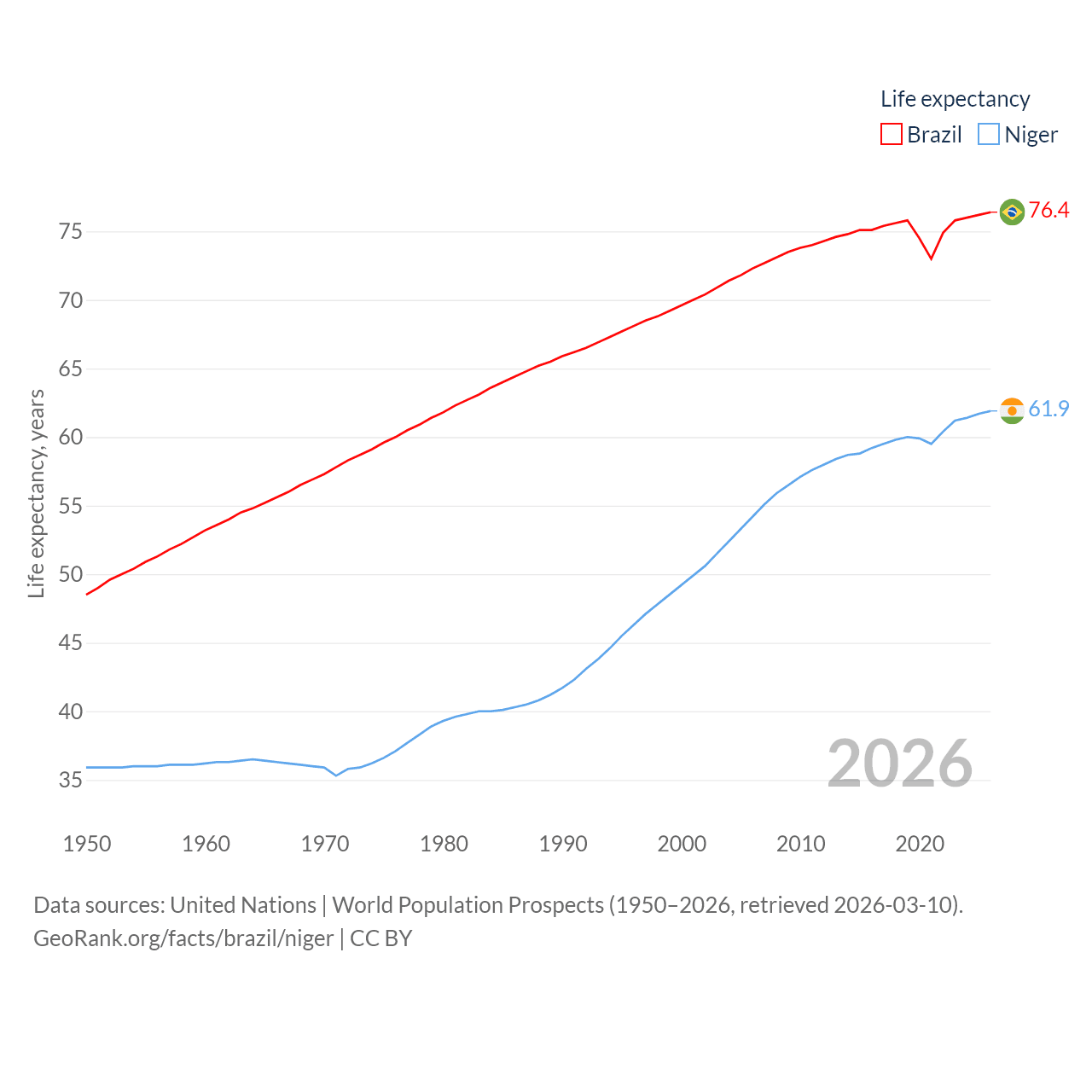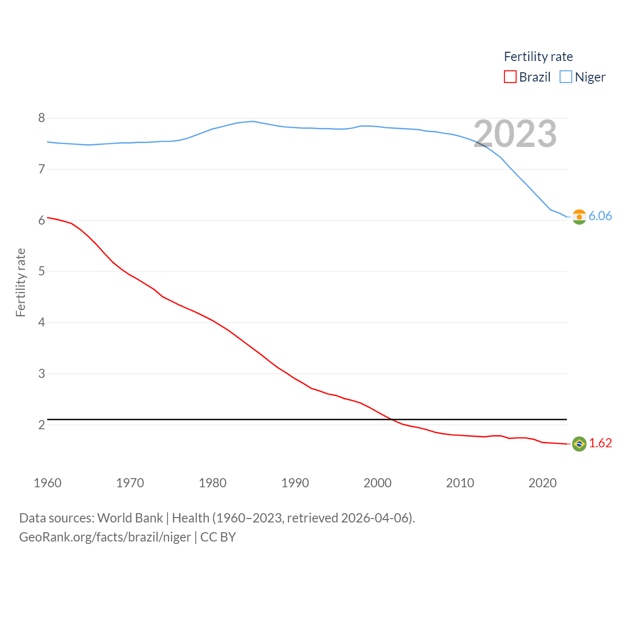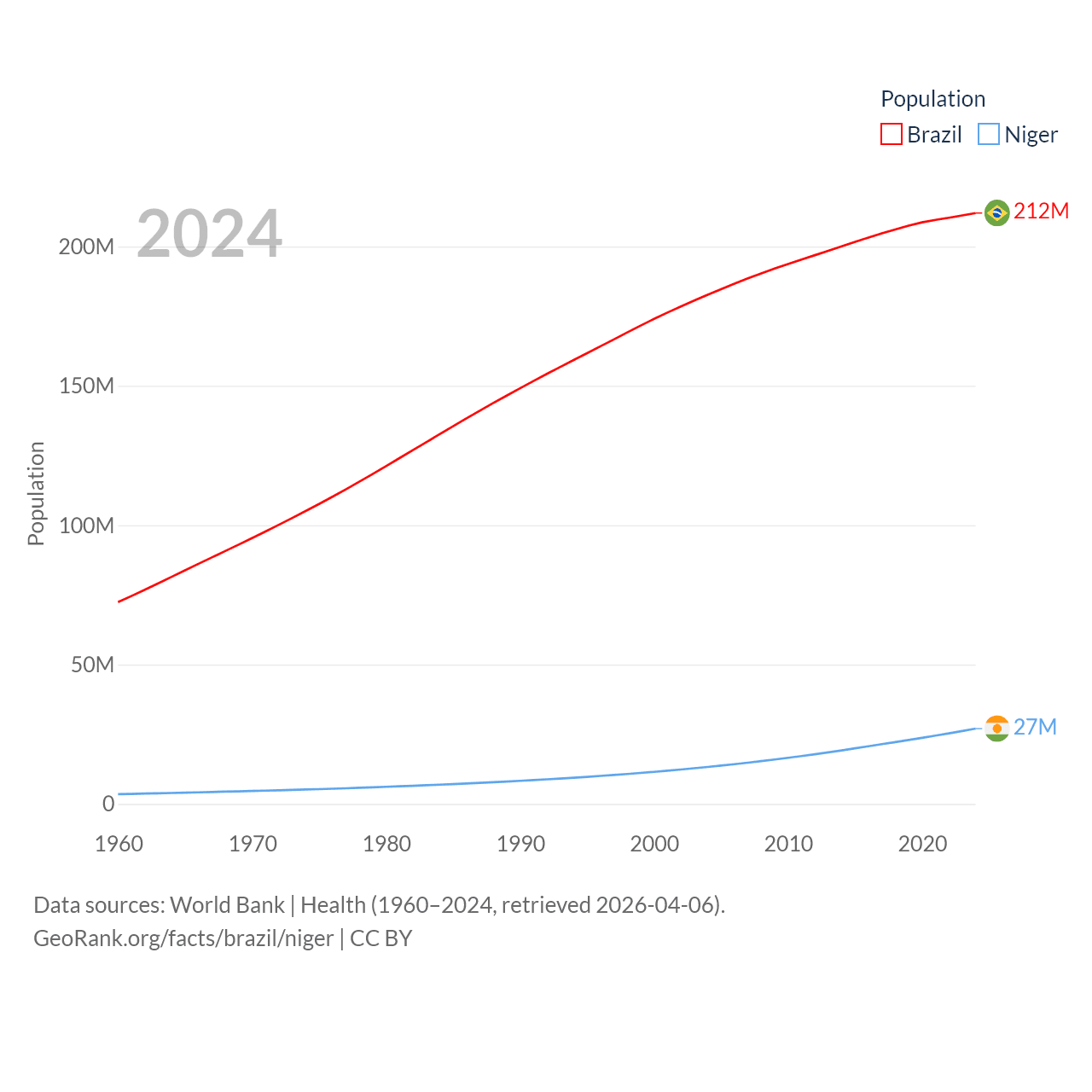 Brazil has a population of 212M (ranked 7/197), compared with 27M in Niger (ranked 55/197). Brazil's land area is 3,227,096 sq mi versus 489,076 sq mi for Niger (ranked 5th vs. 20th).