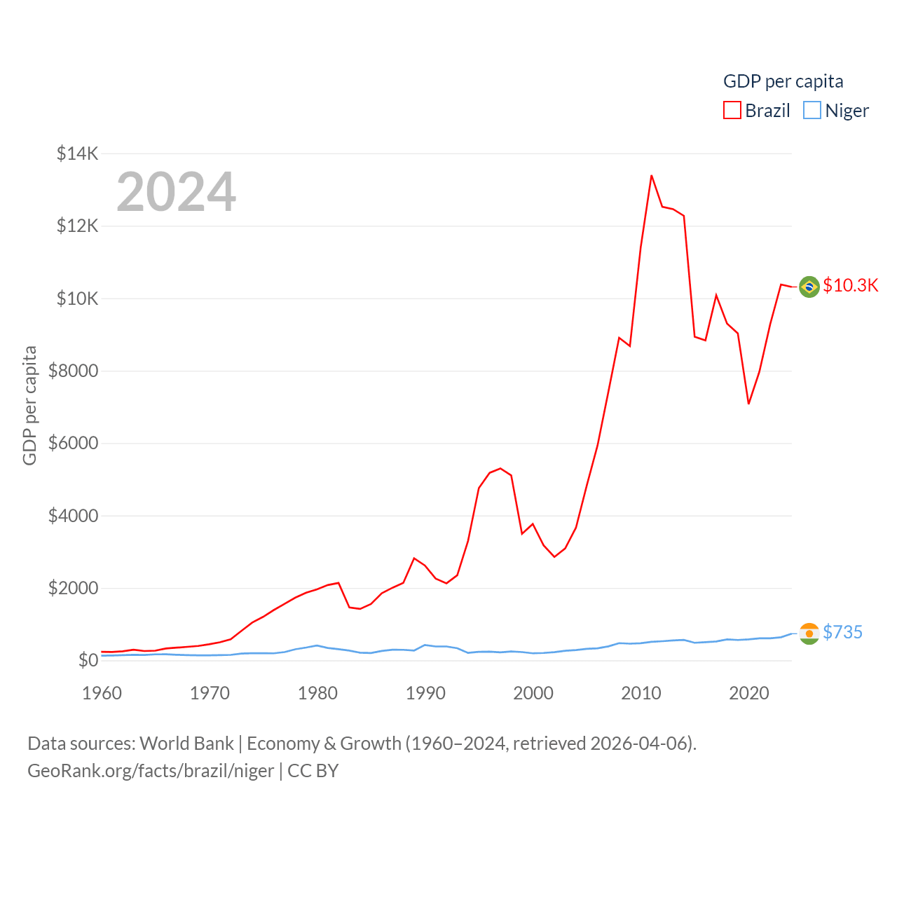 By GDP, Brazil ranks 10/197 ($2.19T) and Niger ranks 130/197 ($19.9B). By GDP per capita, Brazil ranks 85/197 ($10,311), while Niger ranks 187/197 ($735).