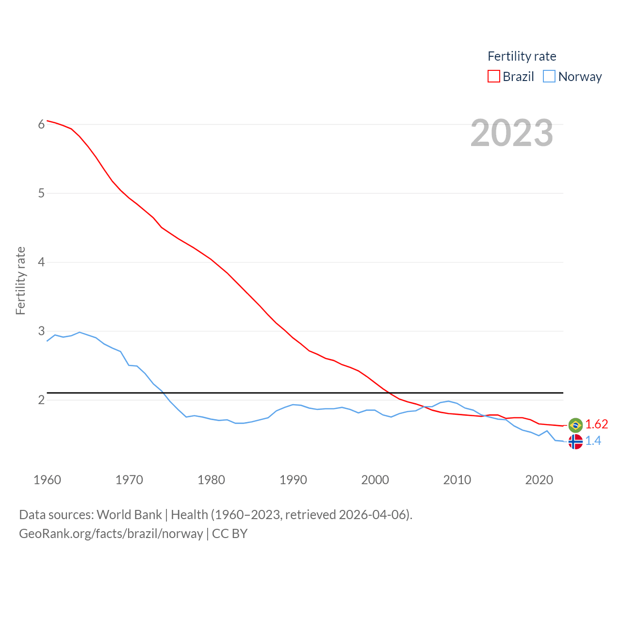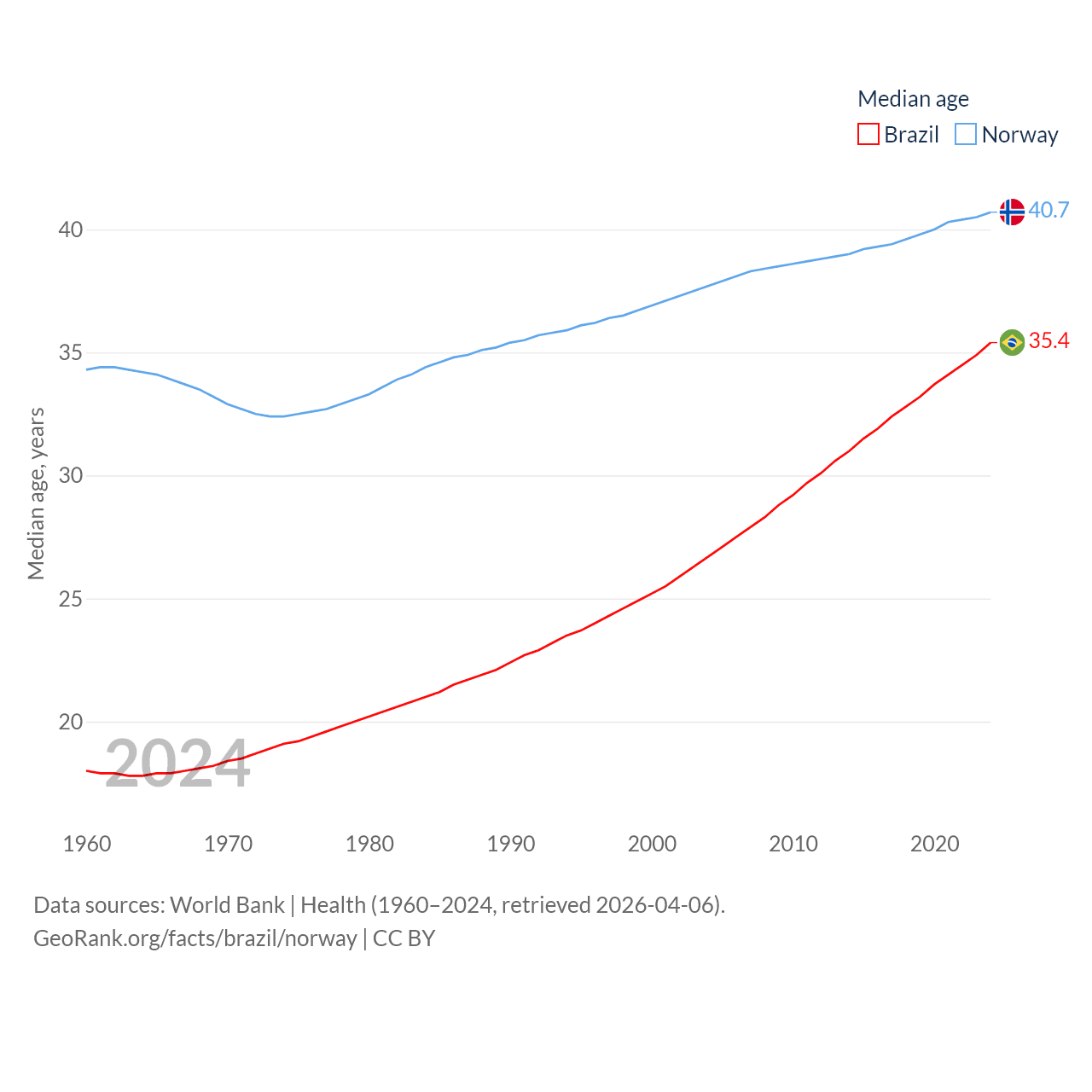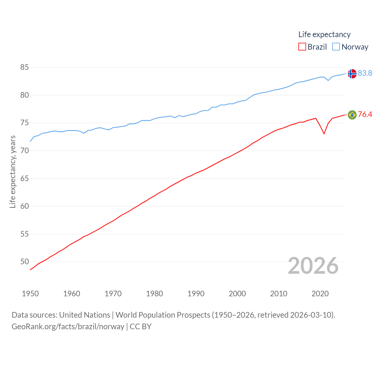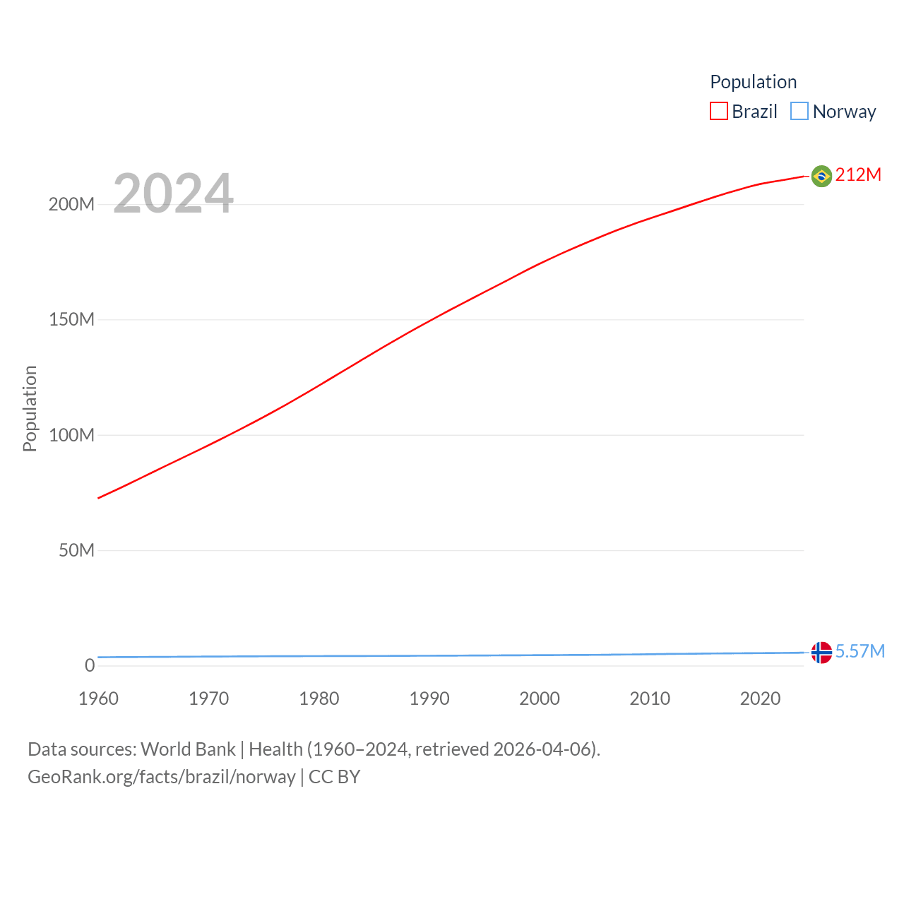 Brazil has a population of 212M (ranked 7/197), compared with 5.57M in Norway (ranked 118/197). Brazil's land area is 3,227,096 sq mi versus 140,645 sq mi for Norway (ranked 5th vs. 62nd).