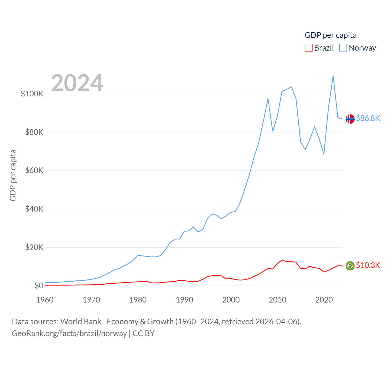 By GDP, Brazil ranks 10/197 ($2.19T) and Norway ranks 32/197 ($484B). By GDP per capita, Brazil ranks 85/197 ($10,311), while Norway ranks 8/197 ($86,785).