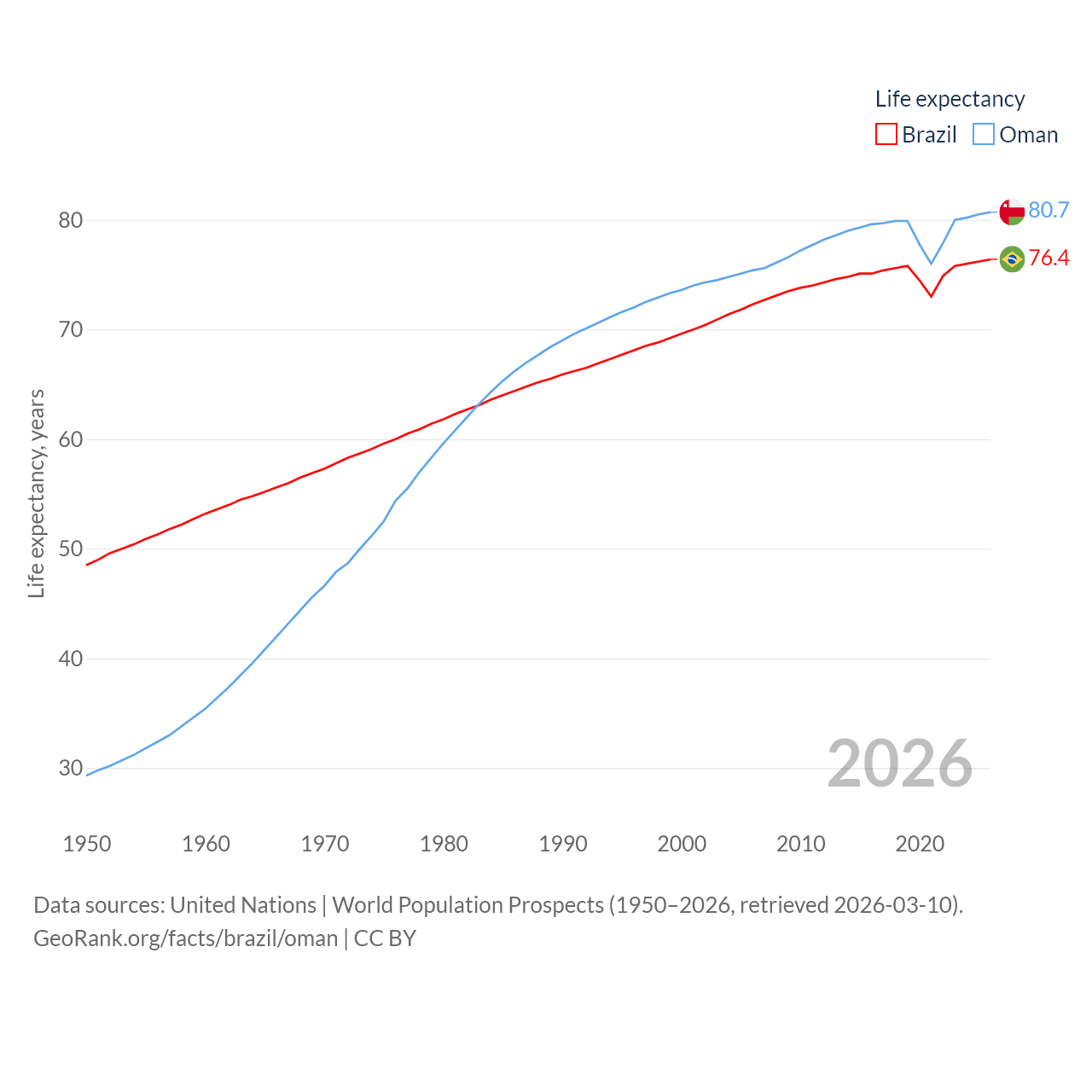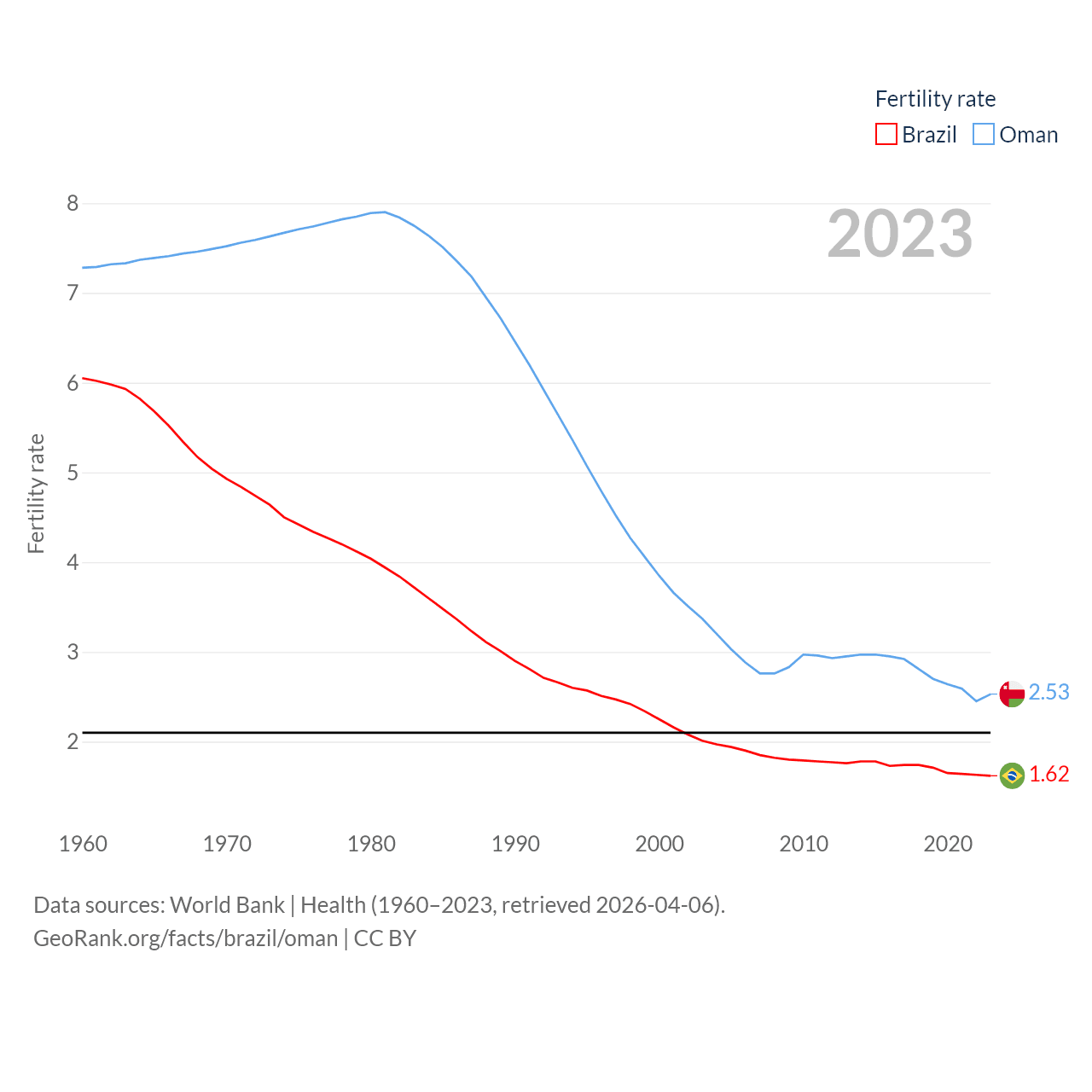 Brazil has a population of 212M (ranked 7/197), compared with 5.28M in Oman (ranked 124/197). Brazil's land area is 3,227,096 sq mi versus 119,499 sq mi for Oman (ranked 5th vs. 68th).