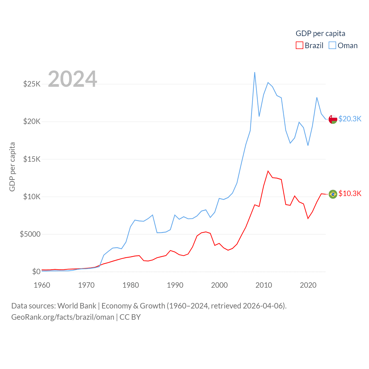 By GDP, Brazil ranks 10/197 ($2.19T) and Oman ranks 70/197 ($107B). By GDP per capita, Brazil ranks 85/197 ($10,311), while Oman ranks 57/197 ($20,285).