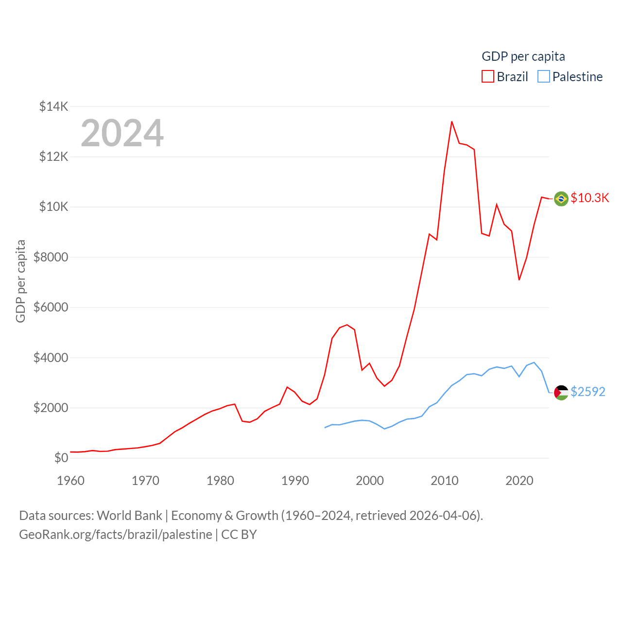 By GDP, Brazil ranks 10/197 ($2.19T) and Palestine ranks 146/197 ($13.7B). By GDP per capita, Brazil ranks 85/197 ($10,311), while Palestine ranks 147/197 ($2,592).