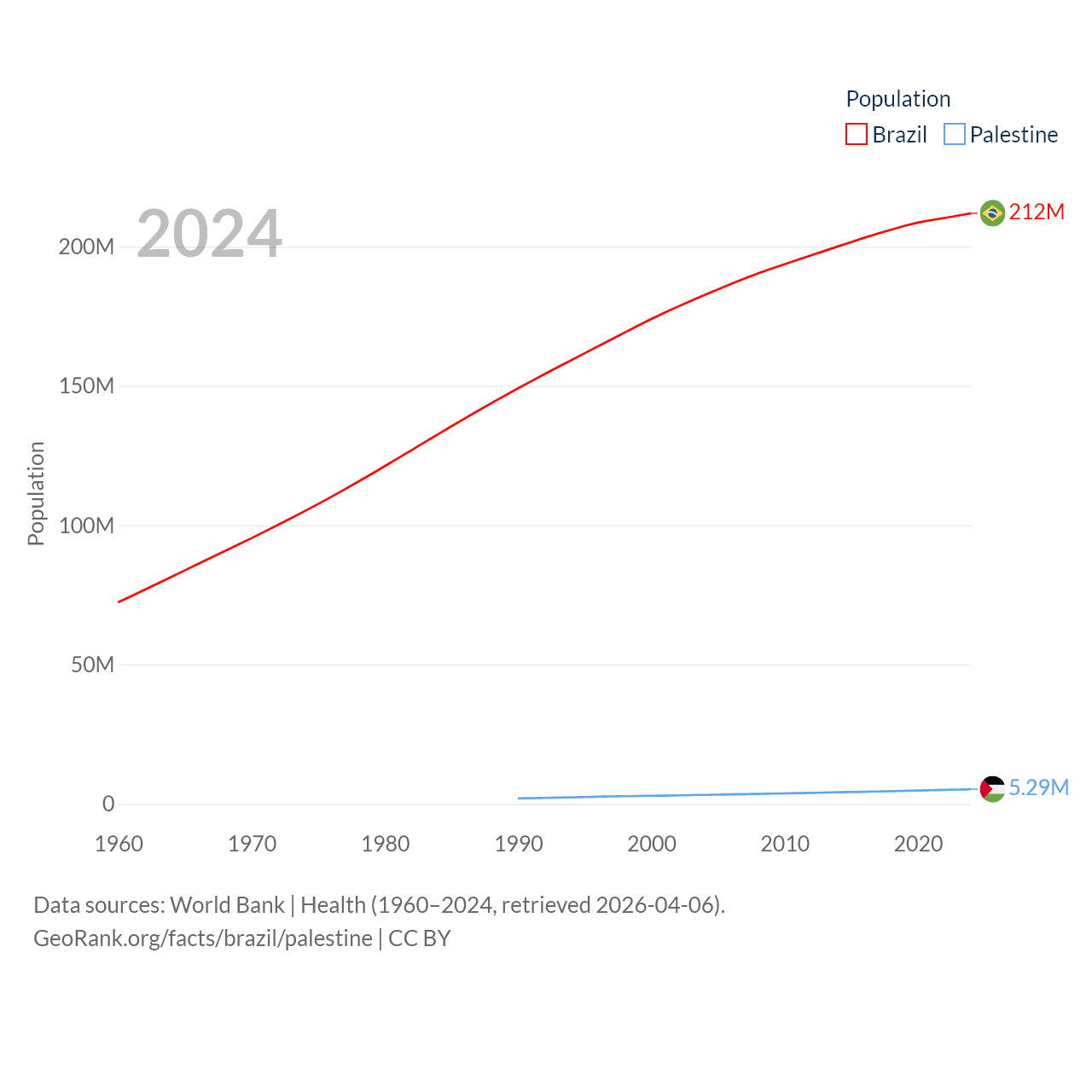 Brazil has a population of 212M (ranked 7/197), compared with 5.29M in Palestine (ranked 122/197). Brazil's land area is 3,227,096 sq mi versus 2,326 sq mi for Palestine (ranked 5th vs. 164th).