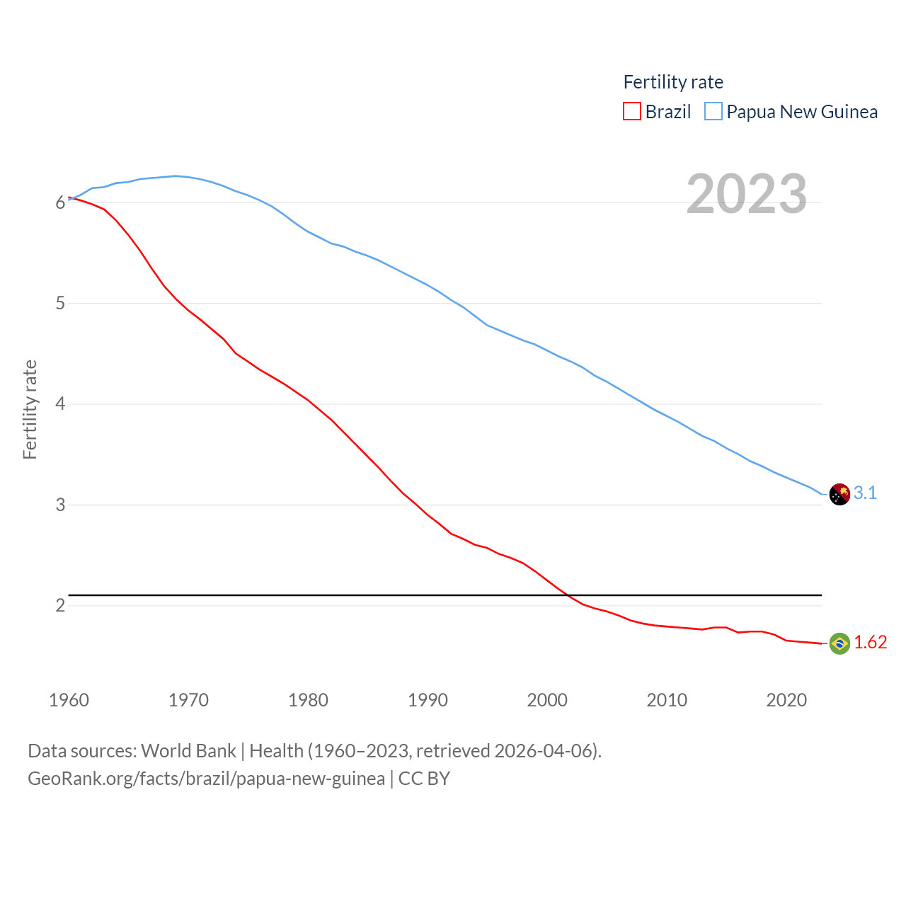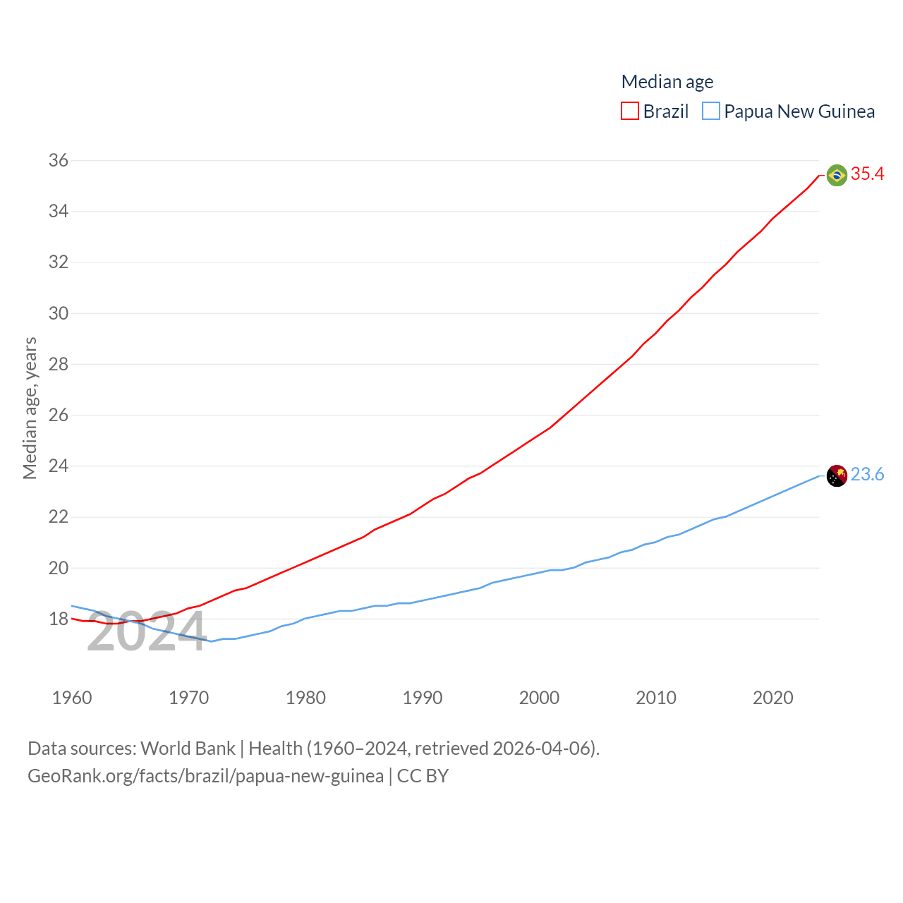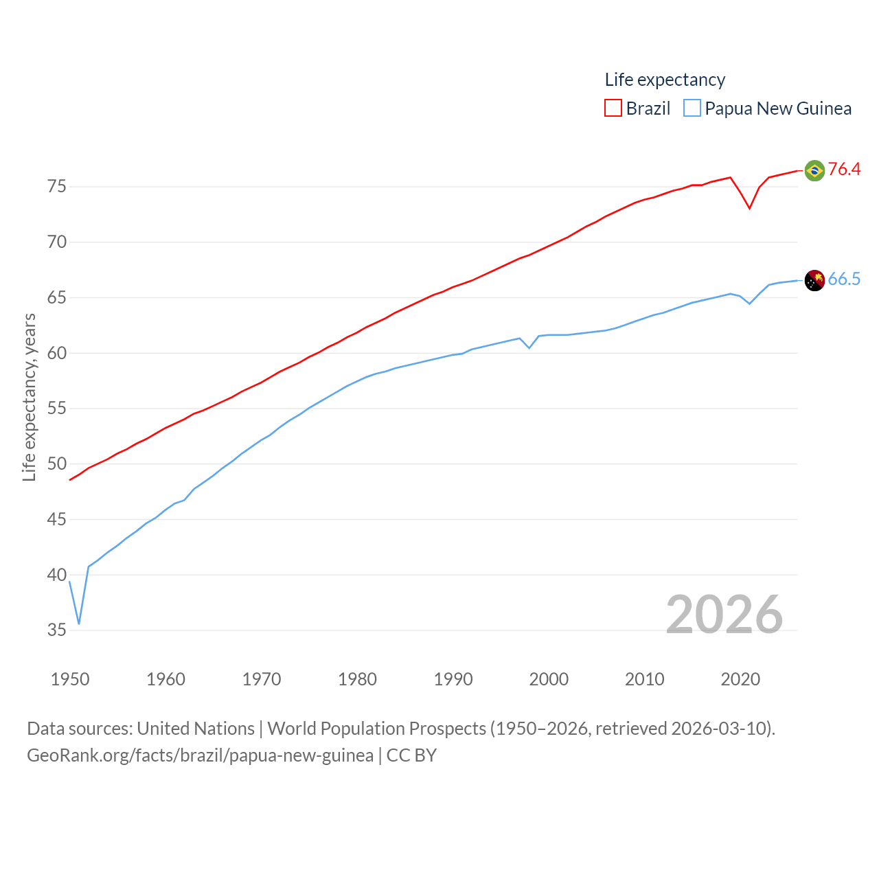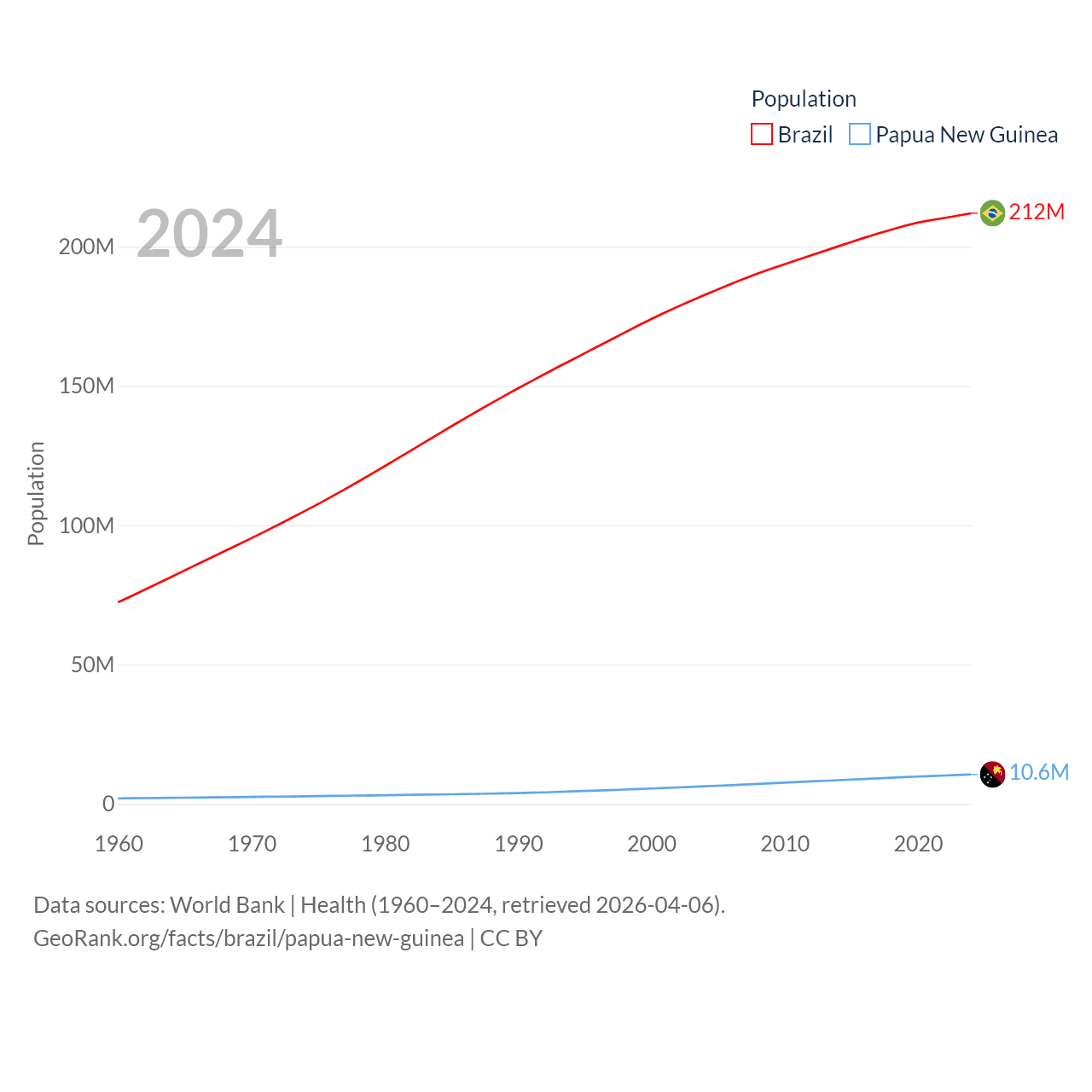 Brazil has a population of 212M (ranked 7/197), compared with 10.6M in Papua New Guinea (ranked 92/197). Brazil's land area is 3,227,096 sq mi versus 174,850 sq mi for Papua New Guinea (ranked 5th vs. 54th).