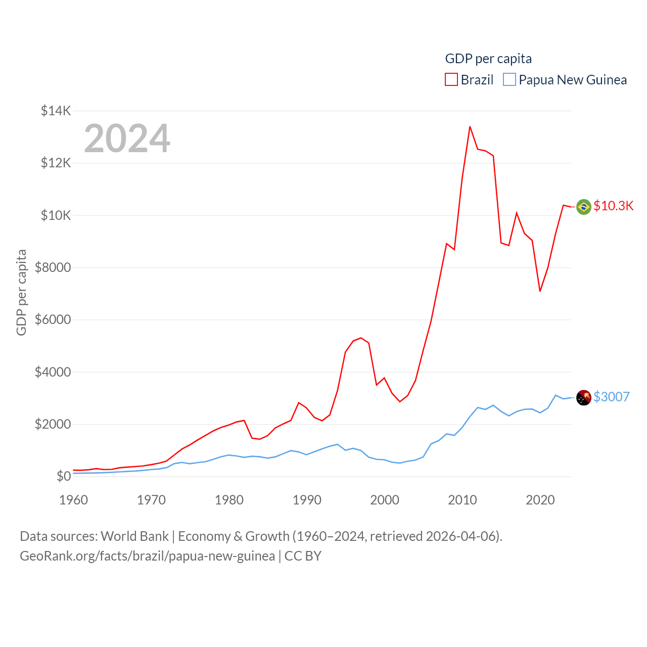 By GDP, Brazil ranks 10/197 ($2.19T) and Papua New Guinea ranks 110/197 ($31.8B). By GDP per capita, Brazil ranks 85/197 ($10,311), while Papua New Guinea ranks 140/197 ($3,007).