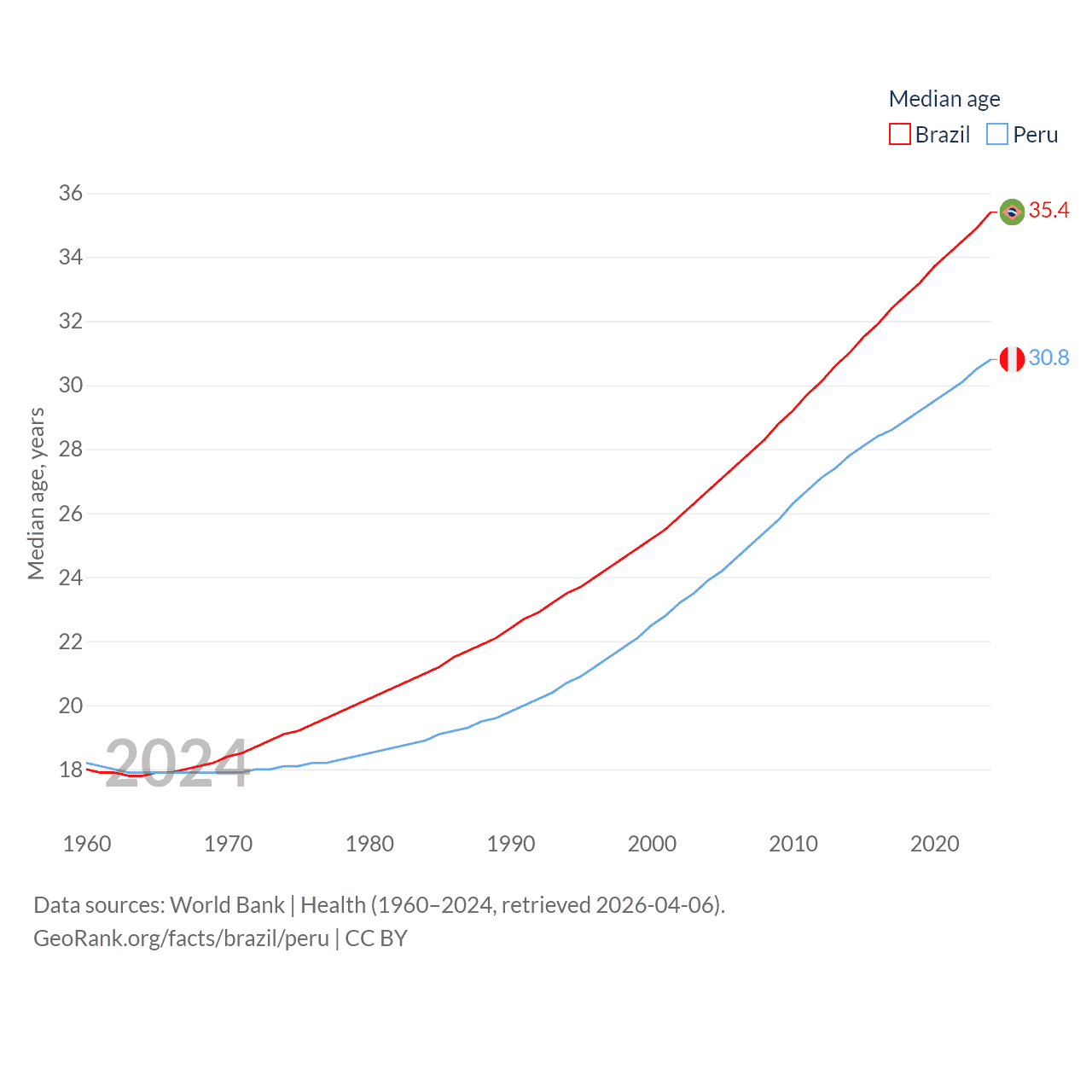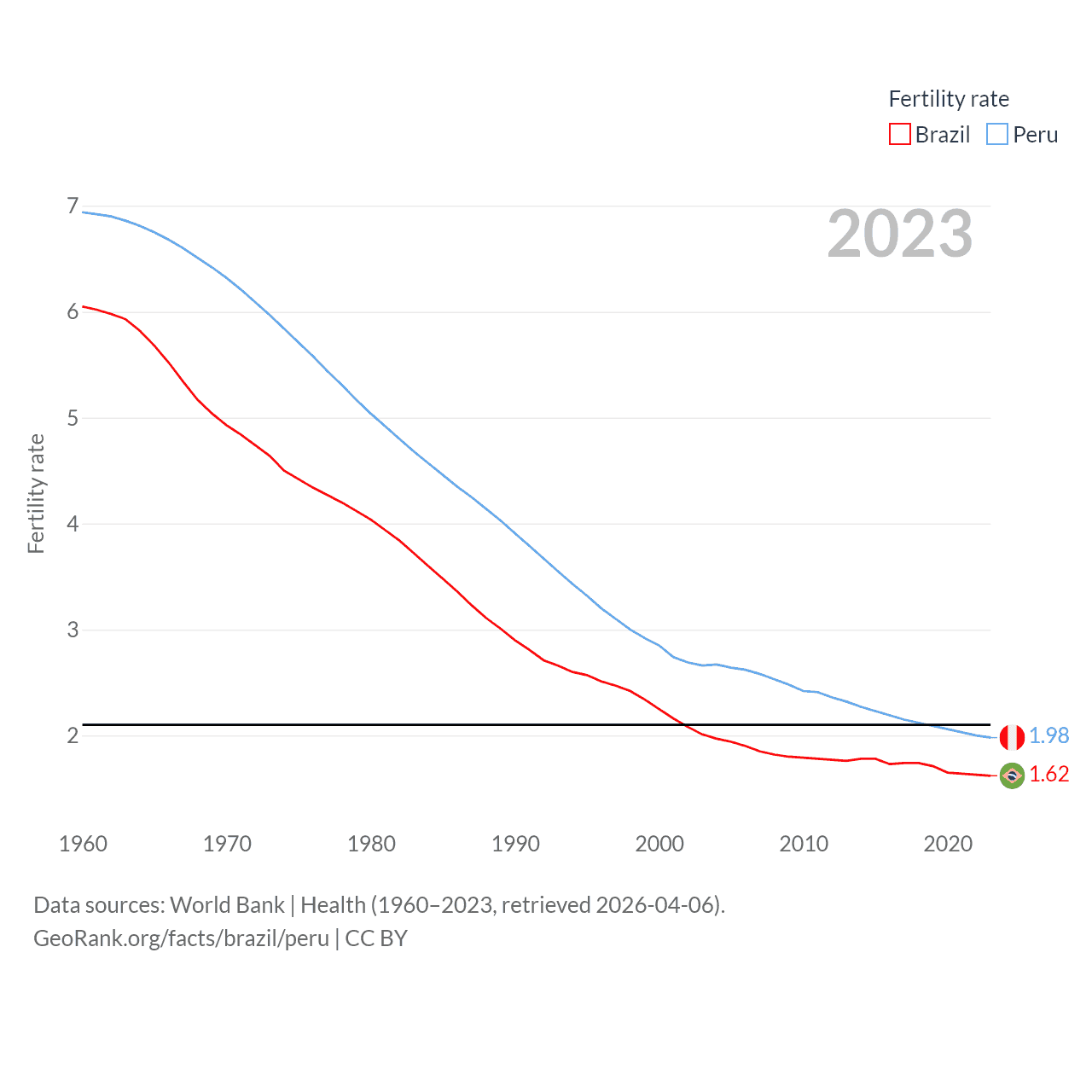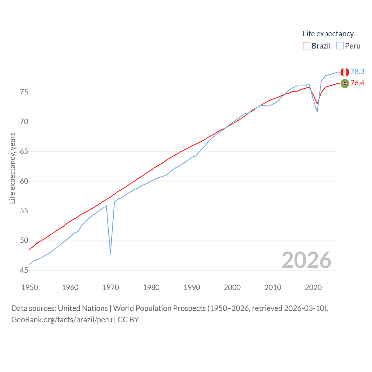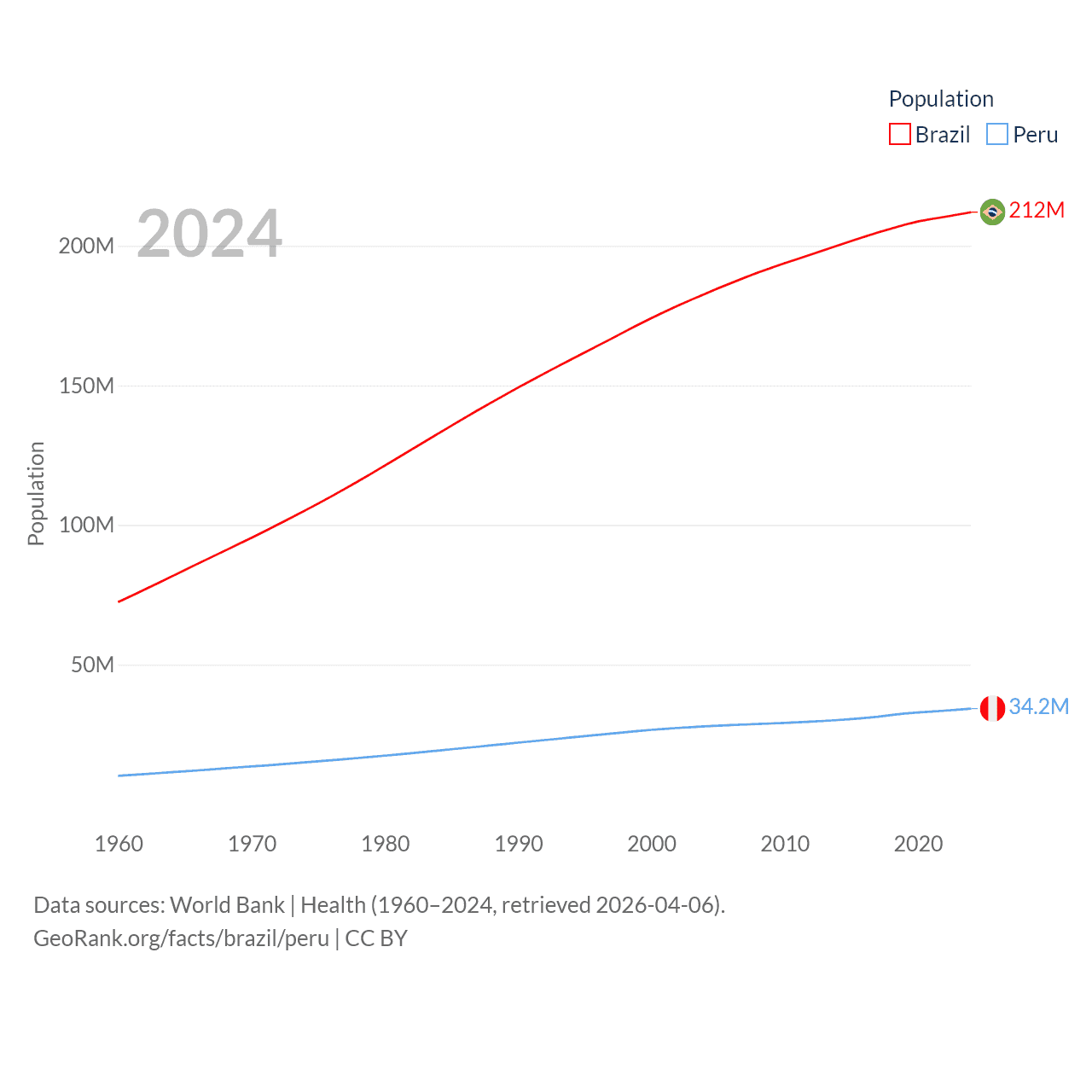Brazil has a population of 212M (ranked 7/197), compared with 34.2M in Peru (ranked 48/197). Brazil's land area is 3,227,096 sq mi versus 494,211 sq mi for Peru (ranked 5th vs. 19th).