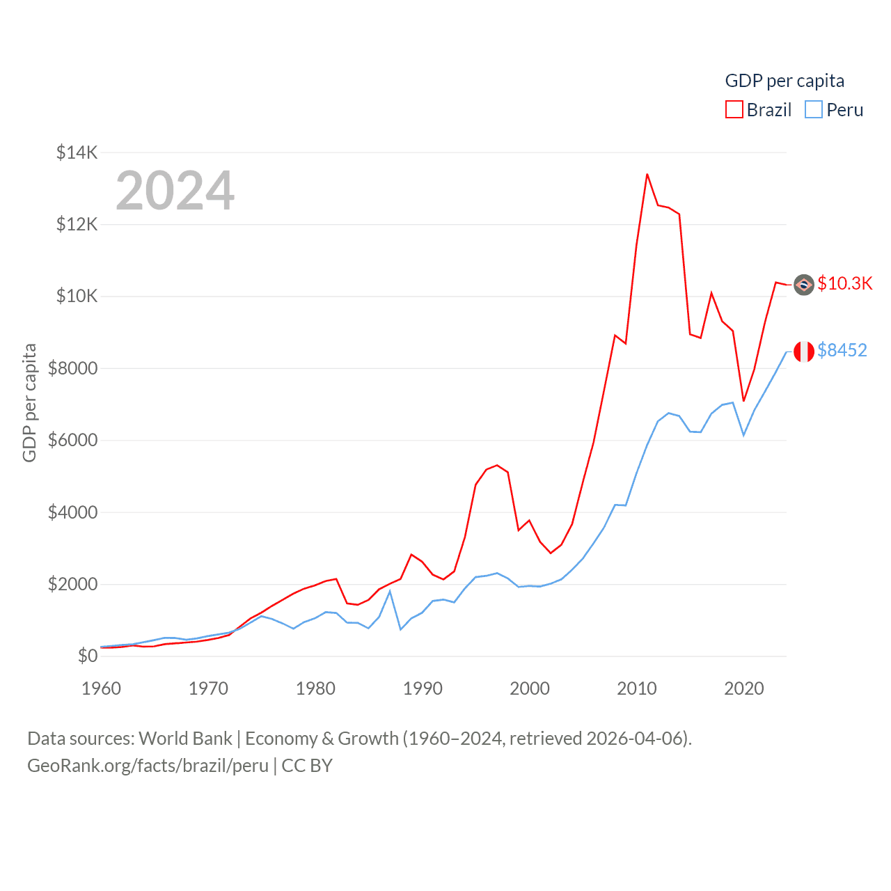By GDP, Brazil ranks 10/197 ($2.19T) and Peru ranks 49/197 ($289B). By GDP per capita, Brazil ranks 85/197 ($10,311), while Peru ranks 91/197 ($8,452).